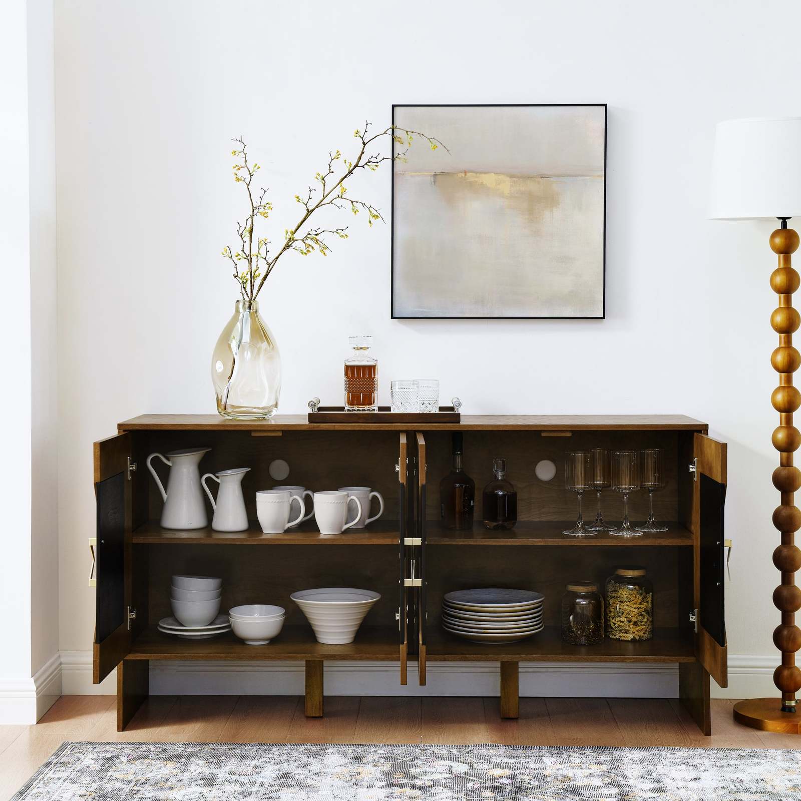 [ Spacious and Flexible Storage Space ] - From fine ornament and kitchen utensils to storage baskets, this sideboard gives you plenty of space and is ideal for storing and organizing household essentials. The interior shelves are height-adjustable for flexible division into different storage areas. Boxwood legs with adjustable feet not only add vintage charm, but also help keep the cabinet level. Dimensions: 15.75'D x 60'W x 31.5'H.