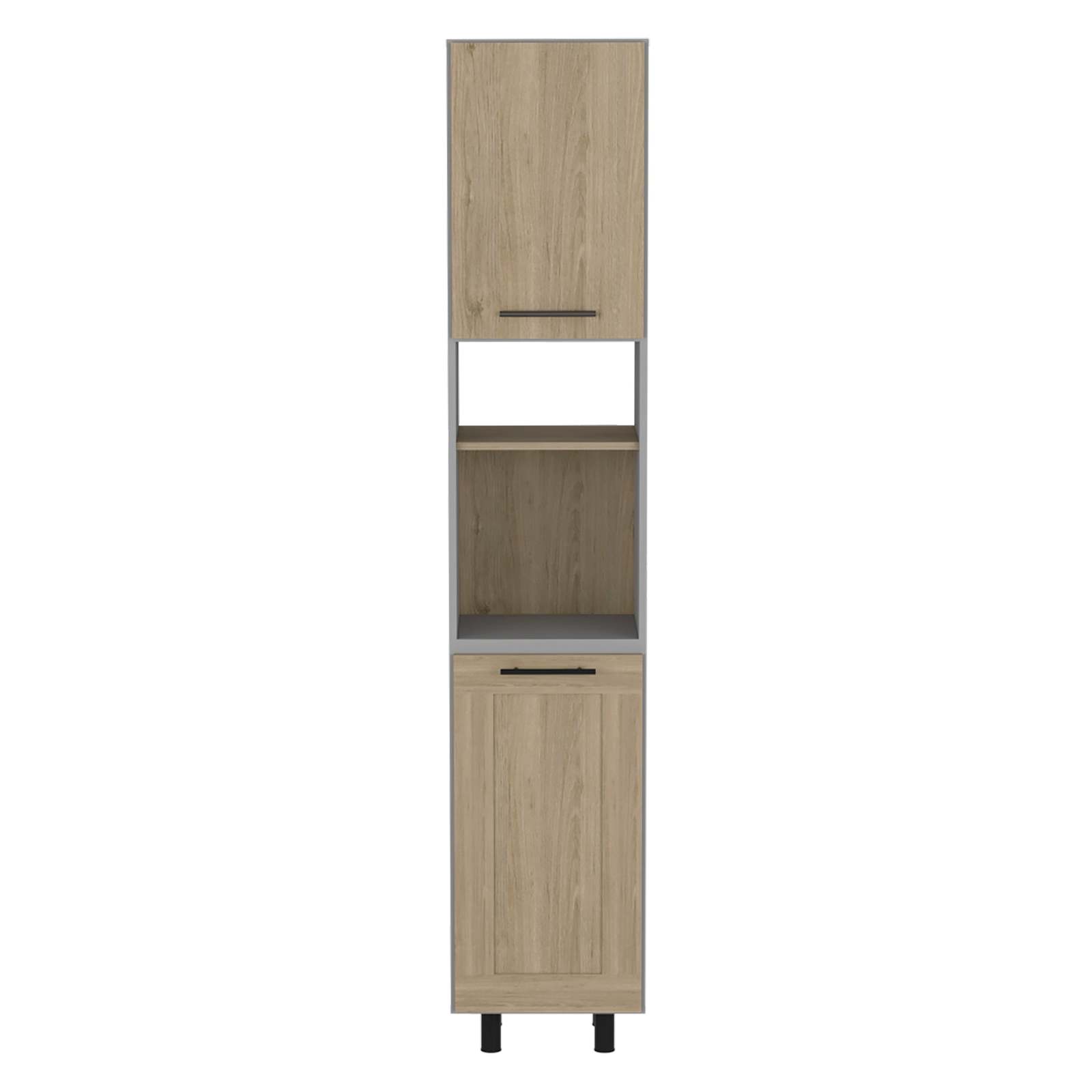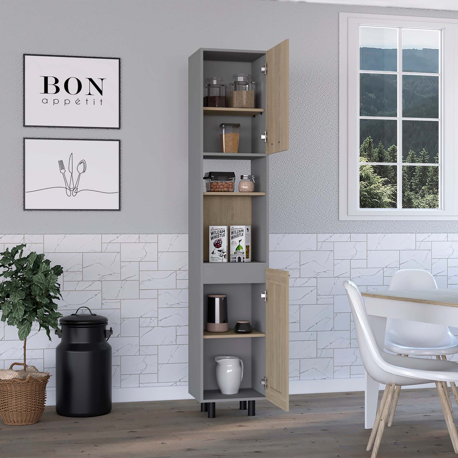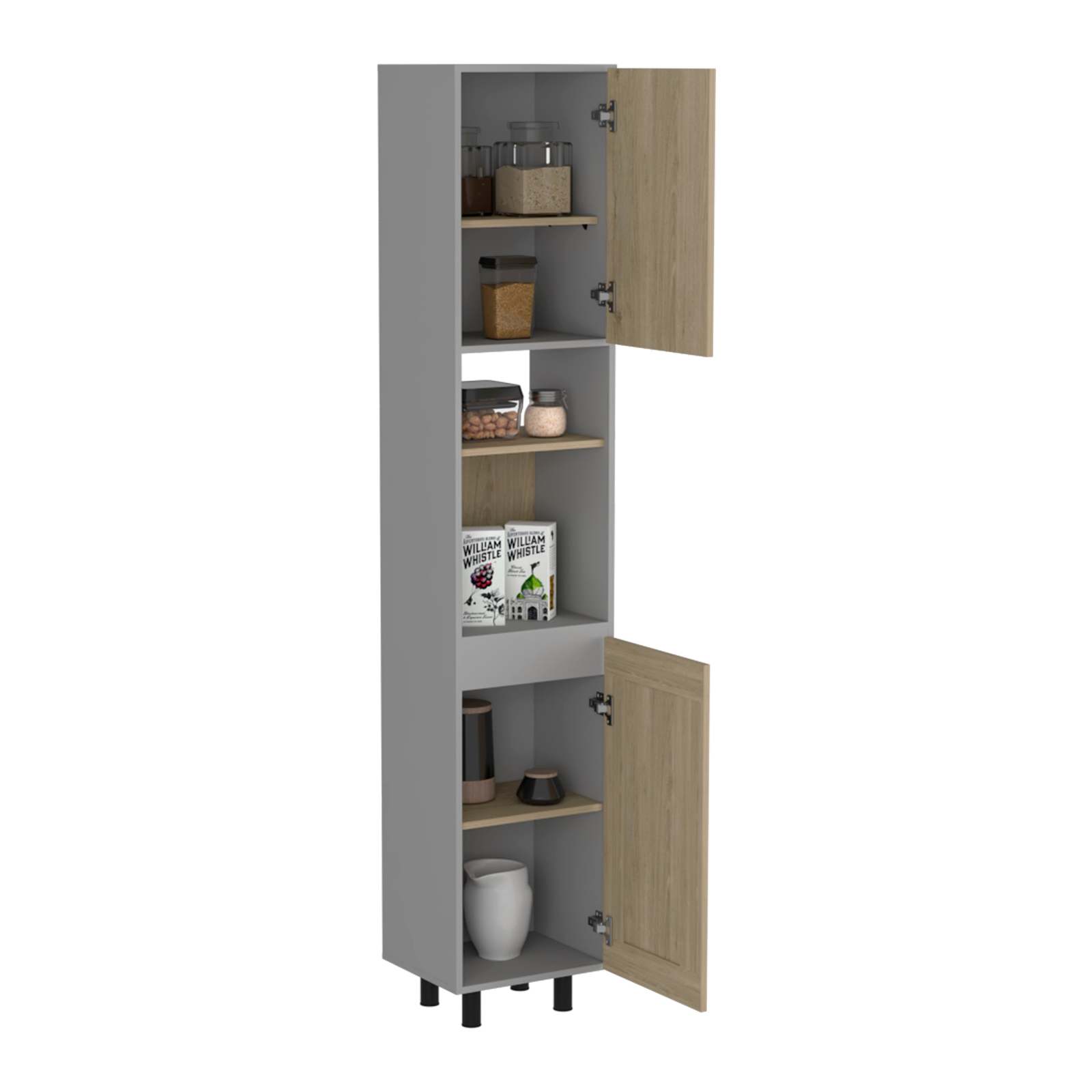 The beautiful design of the TUHOME Hasselt Kitchen Pantry is sure to complement any kitchen decor. The neutral color palette will match any existing furnishings, while the modern style will add a touch of elegance to your space. Designed with the perfect combination of light pine and white manufactured wood finish. The Hasselt Kitchen Pantry is the ideal storage solution for any kitchen. Its sleek, modern style includes six shelves (15,1''H X 14,5''W) and two cabinet doors, providing ample space for all your kitchen items. The strong and sturdy construction ensures that this pantry will last for years.