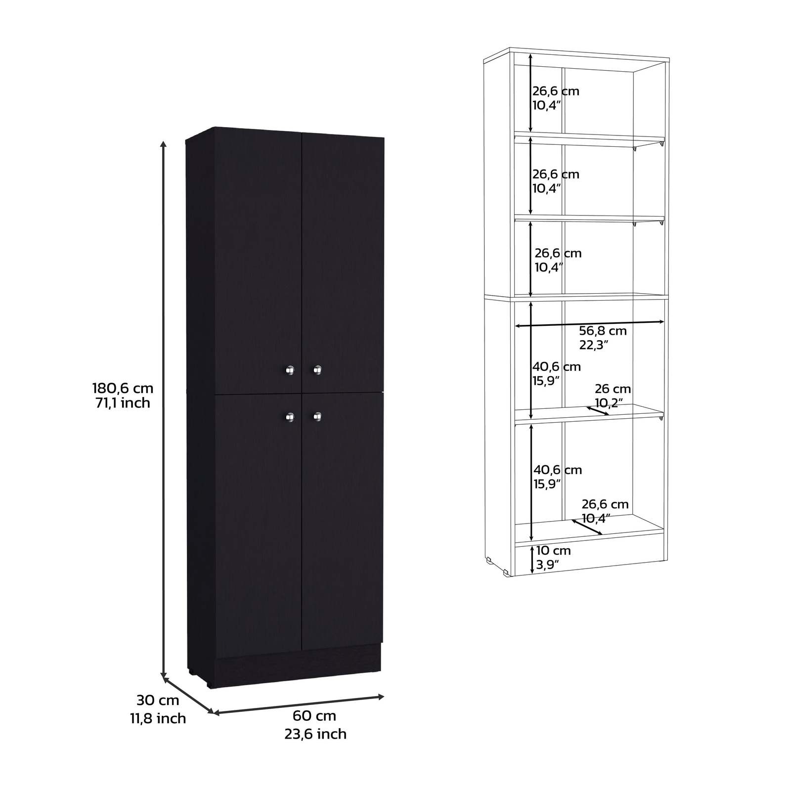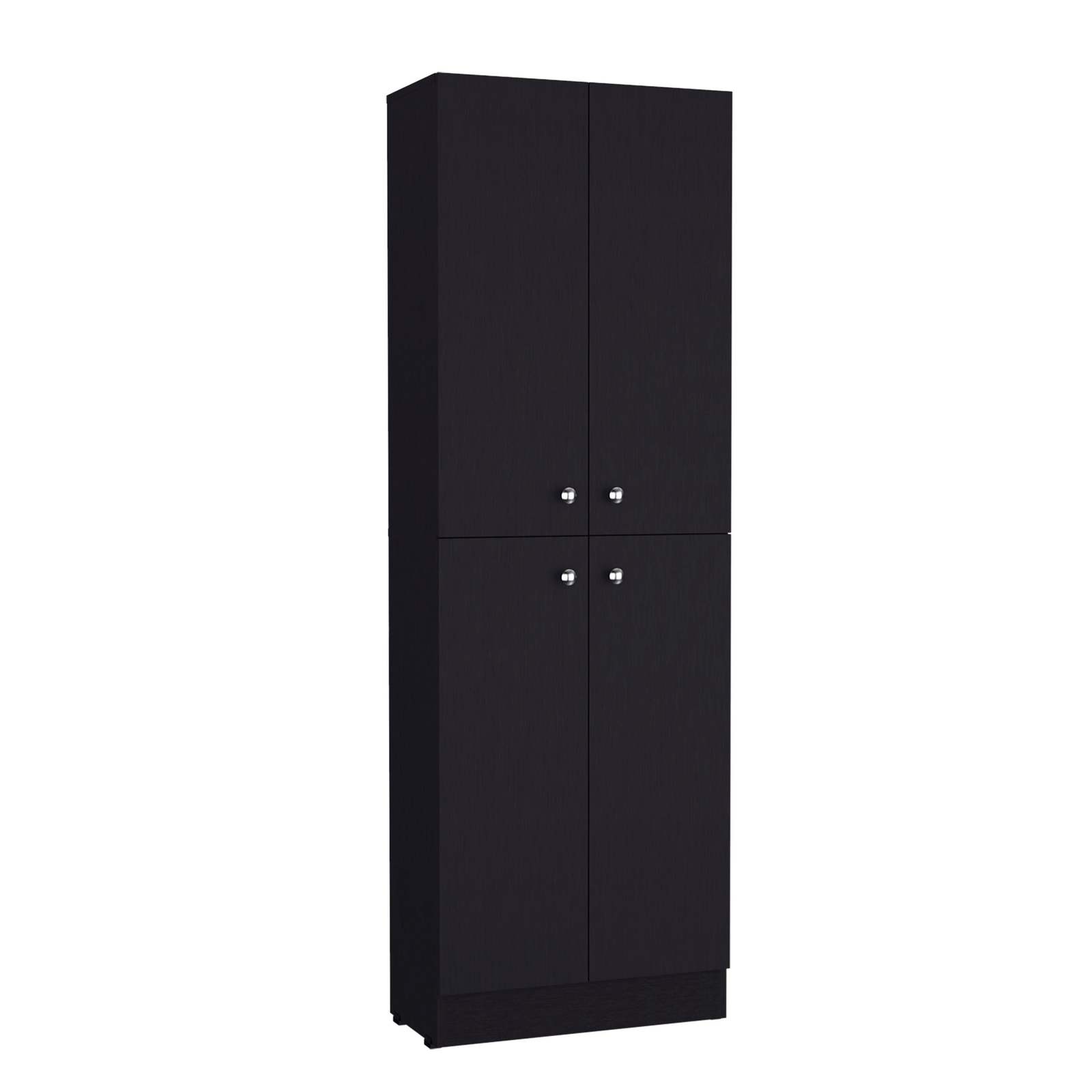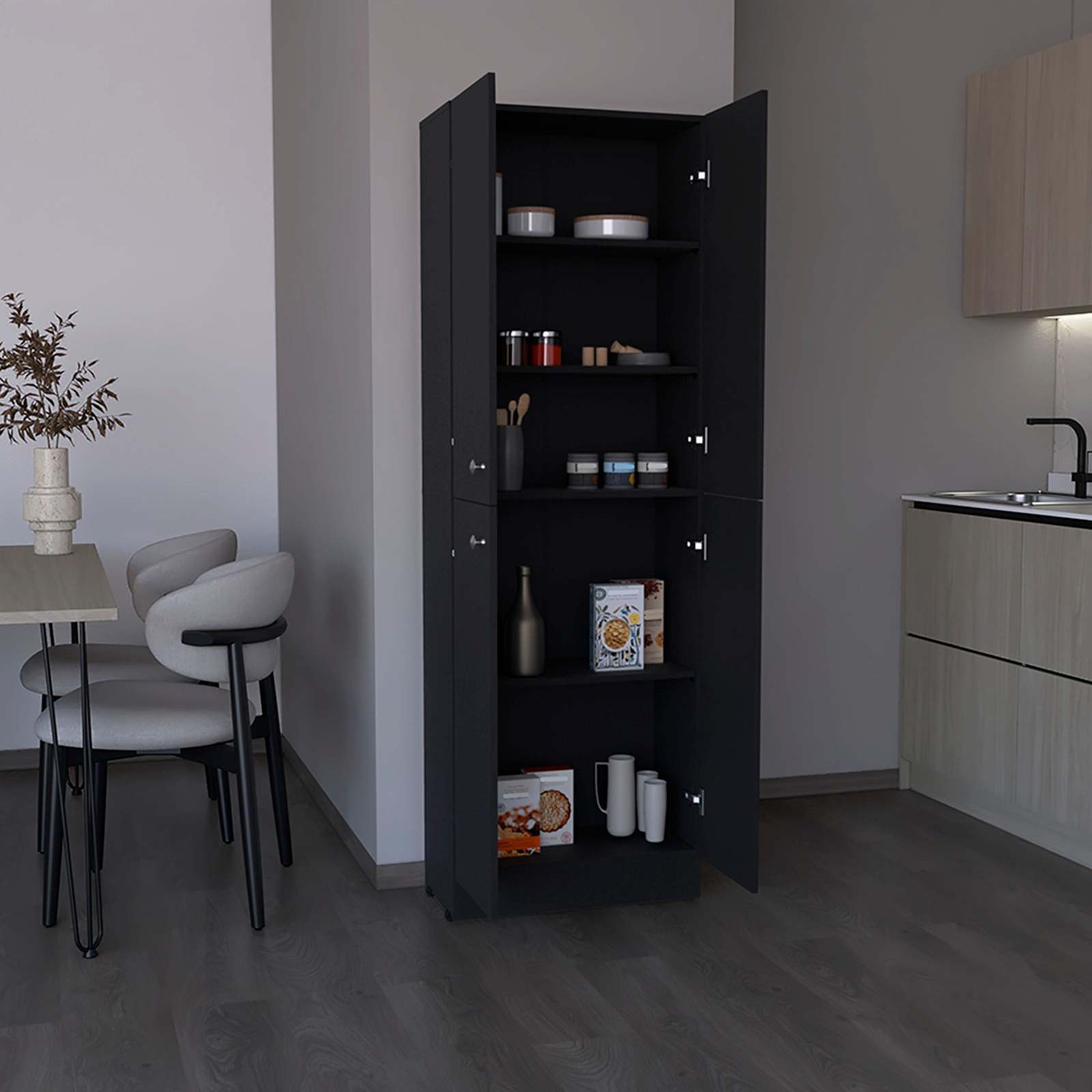 Black Kitchen Pantry: 71"H, 4 Doors, 5 Shelves