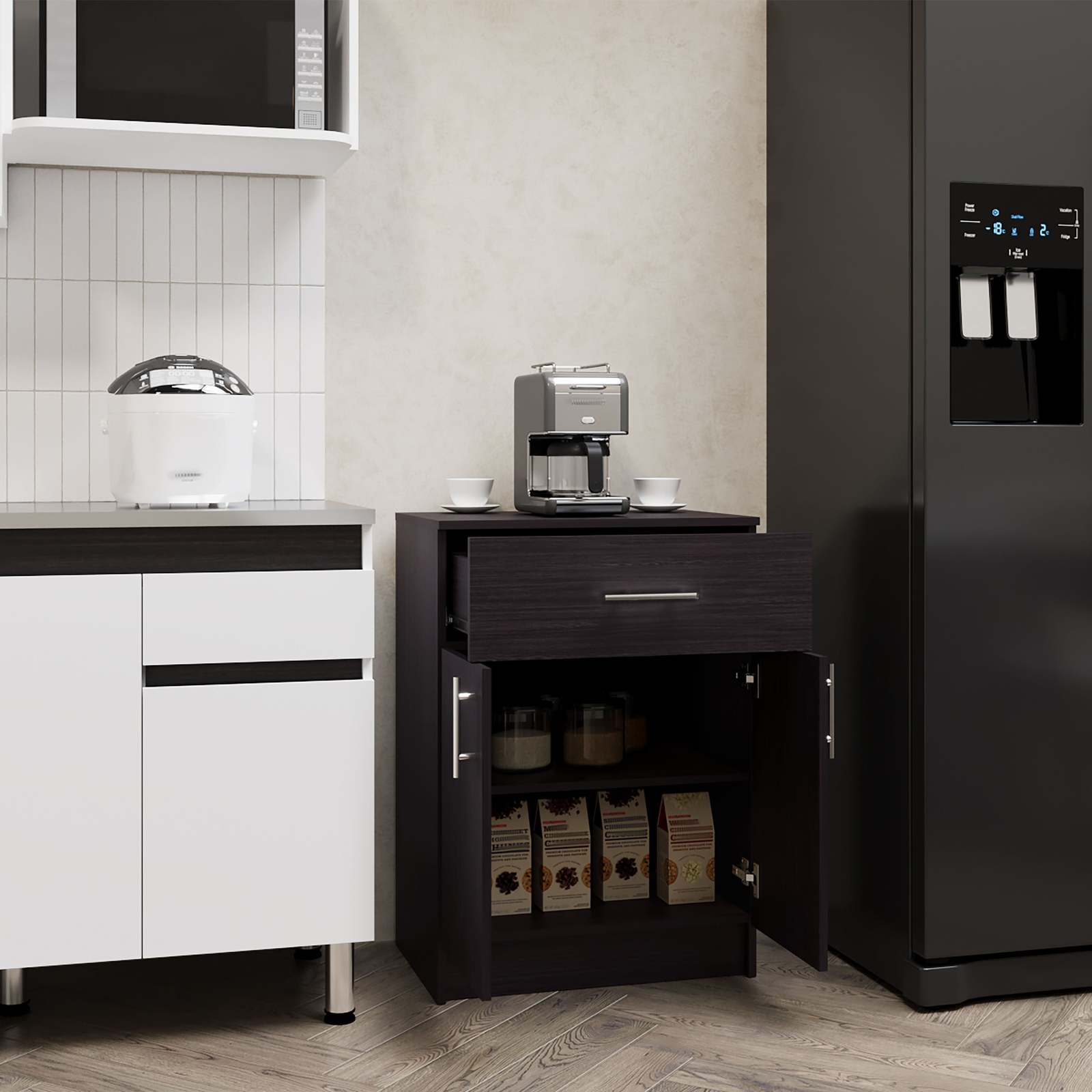 Blends seamlessly with various kitchen decors while providing essential storage.