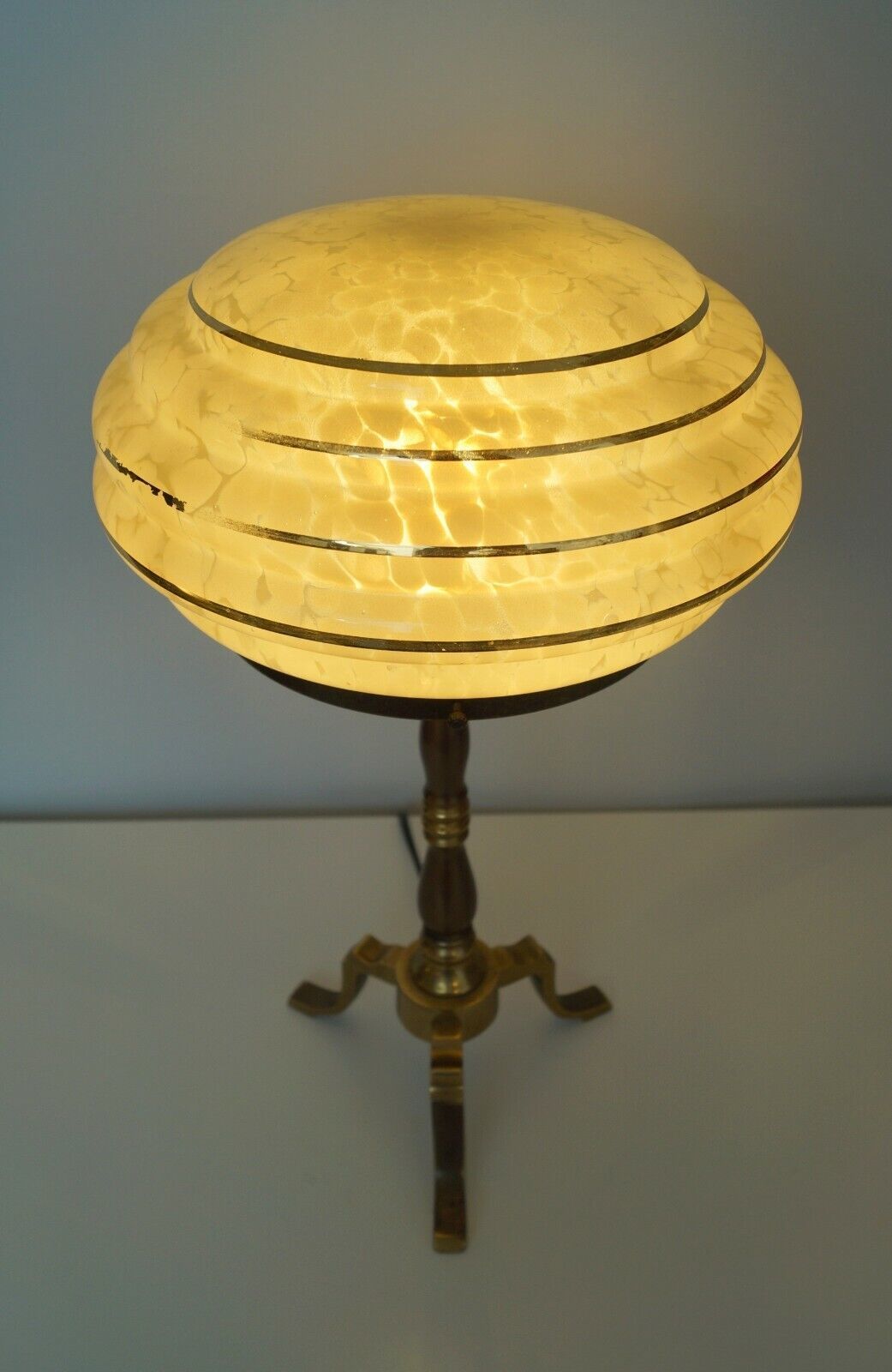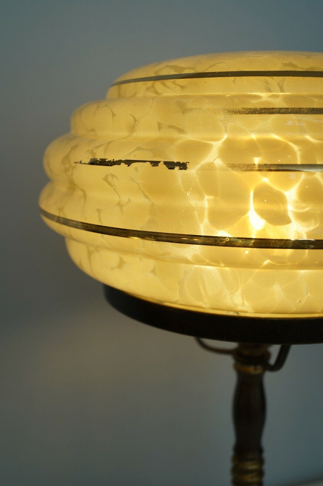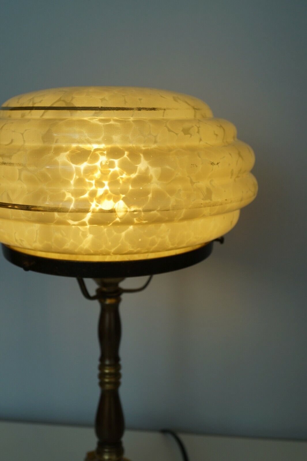 Beautiful Art Deco desk lamp. Around 1940 - 1950. Vintage brass gear with beautiful antique patina. Total height approx. 39 cm, umbrella diameter approx. 20 cm. Completely new electrical installation. PVC supply line with cord intermediate switch. 1 x antiquity E 27 brass version with porcelain raise, up to max. Max. 40 watts - we urgently recommend LED lamps. Hundreds of more kind of deco lights in our shop! Small parts such as screws and washers renewed. Please note: All of our lights have been circulated well before 2005, are in their original condition and therefore do not fall under the electrical and electronic device law (WEEE guideline of the EU).