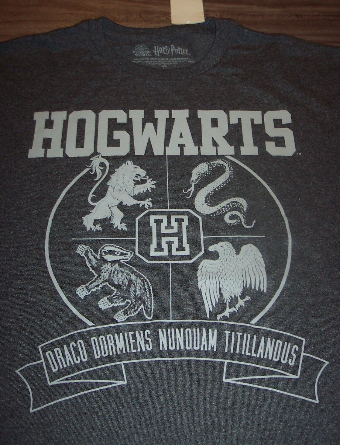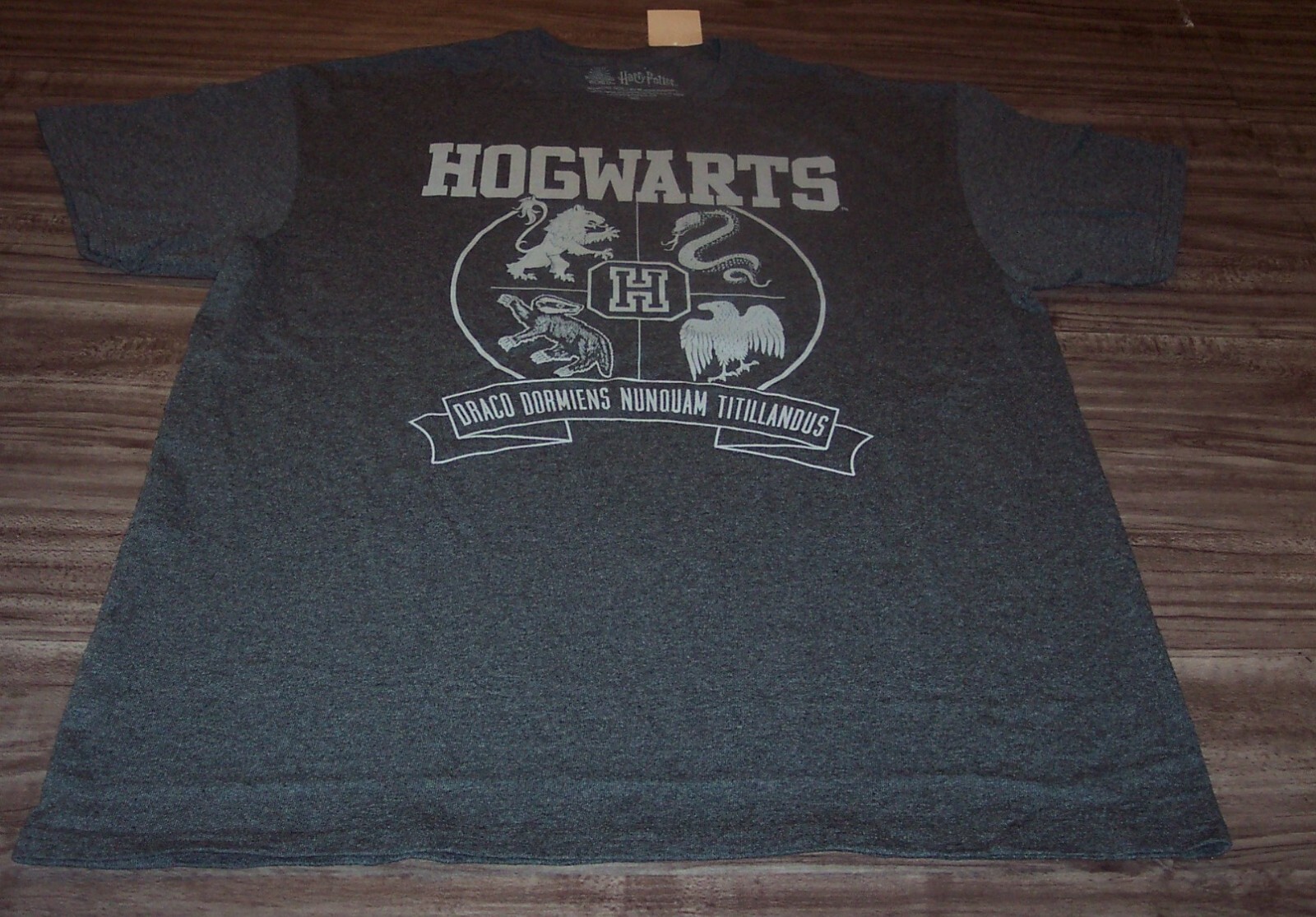 This is a HARRY POTTER HOGWARTS T-shirt. It is a size LARGE, and it is NEW w/ the tag. It is 22 inches from armpit to armpit and 30 inches in length. Combine auctions to save on shipping. AD