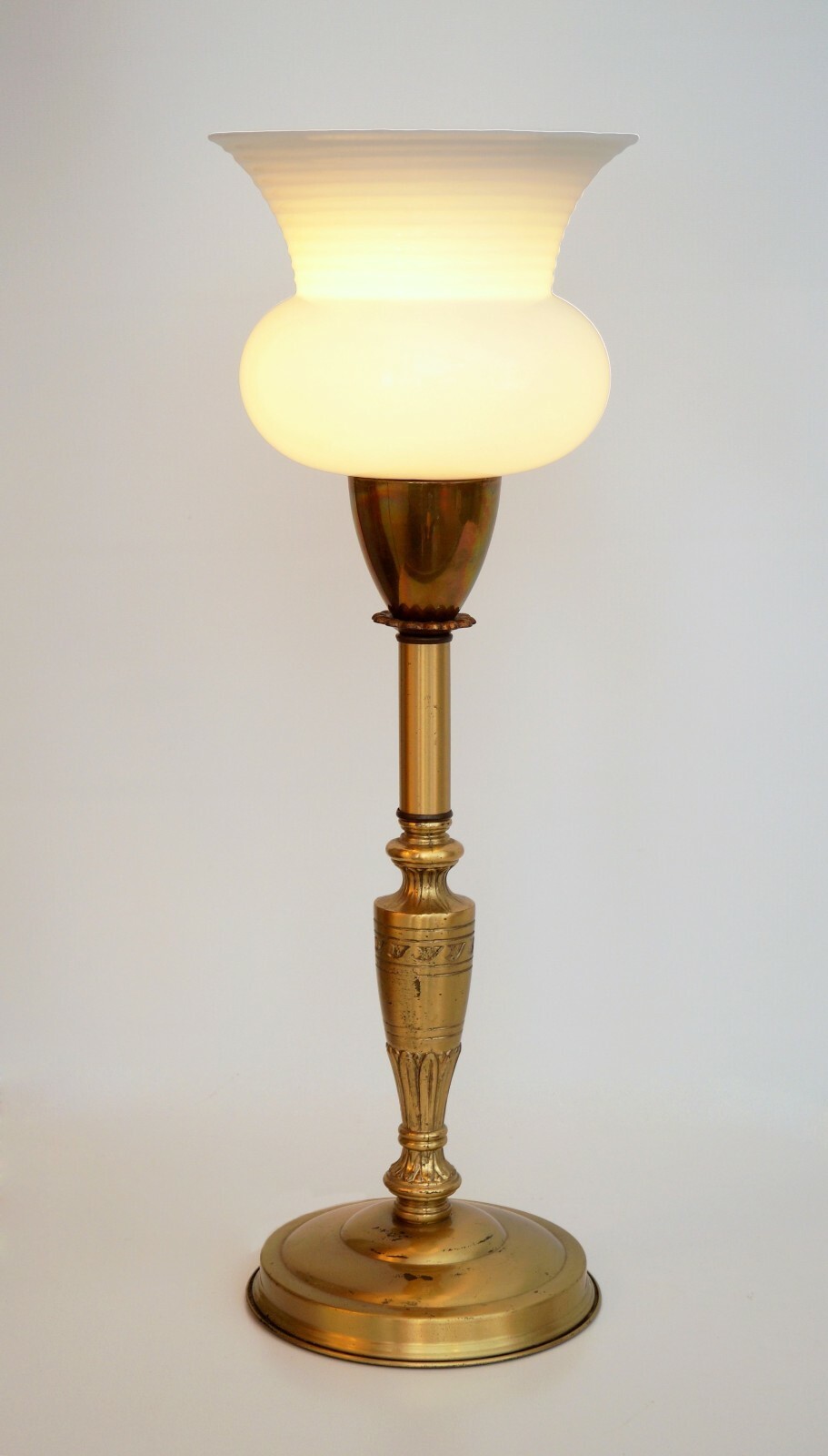 Elegant design unique from our lighting manufacturer-the only copy worldwide! Art Deco desk flooder with subtle patina and light signs of age and use (see detailed photos). Partially running brass gear - see detailed photos. Pure white opal glass with fantastic lighting effect. Total height approx. 57 cm, umbrella diameter approx. 20 cm. Completely renewed electrical installation. PVC supply line with cord intermediate switch. Antique E27 brass version, up to max. 60 watts - we strongly recommend LED lamps! Small parts such as screws or washers have been renewed. Sale without decoration and lamp! Shipping within Germany free of charge!