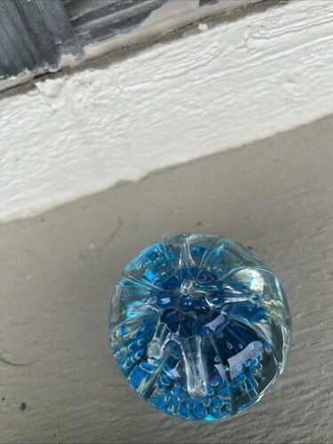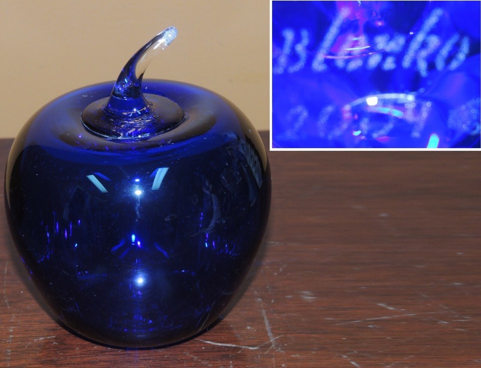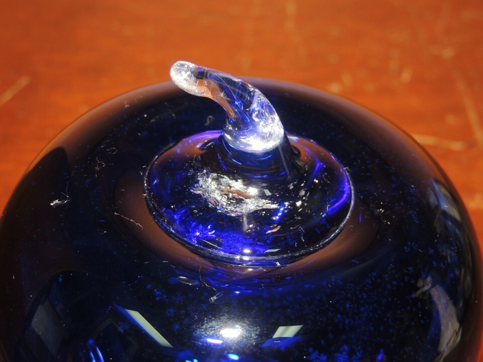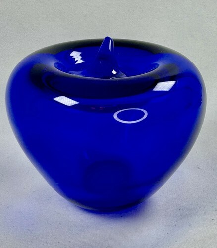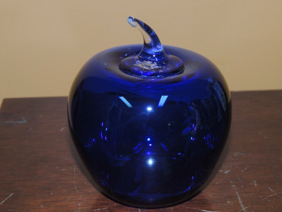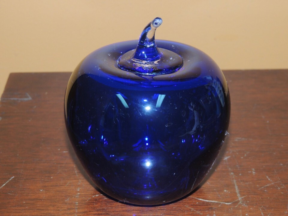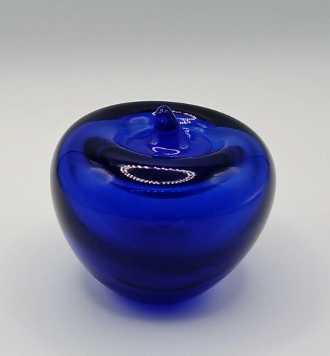 Blenko 2004 Art Glass Hand Blown Apple 4.5" Cobalt Blue Paper Weight etched mark