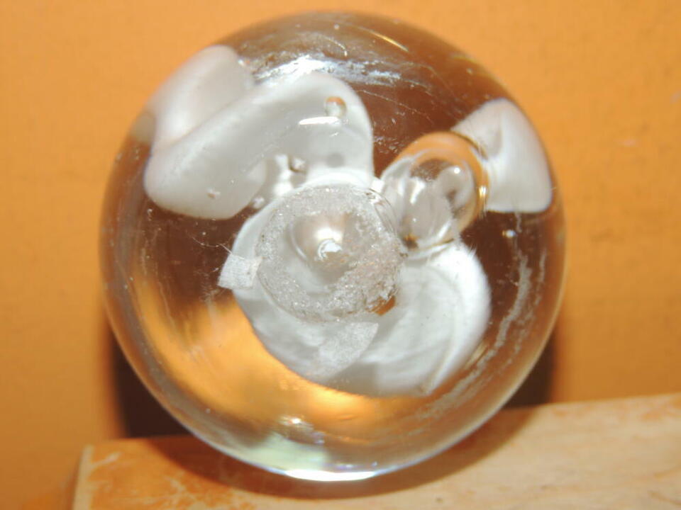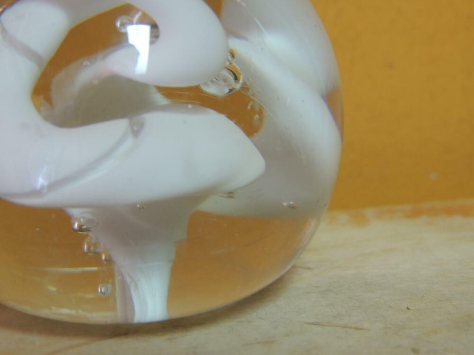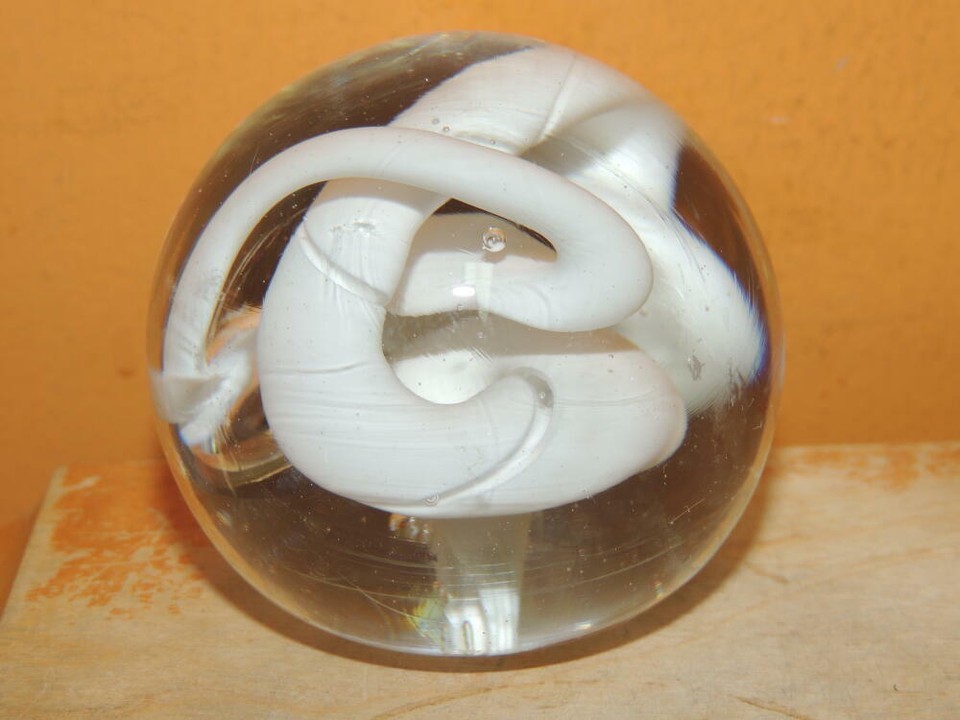 Art Glass Paperweight 2.25"+ clear with white twisting ribbon swirls bubbles