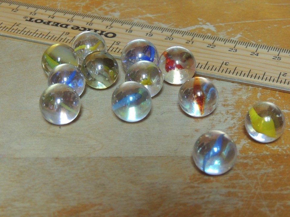 Lot of 12 Glass Marble .5"+ Banana Catseye yellow blue red iridescent Vintage