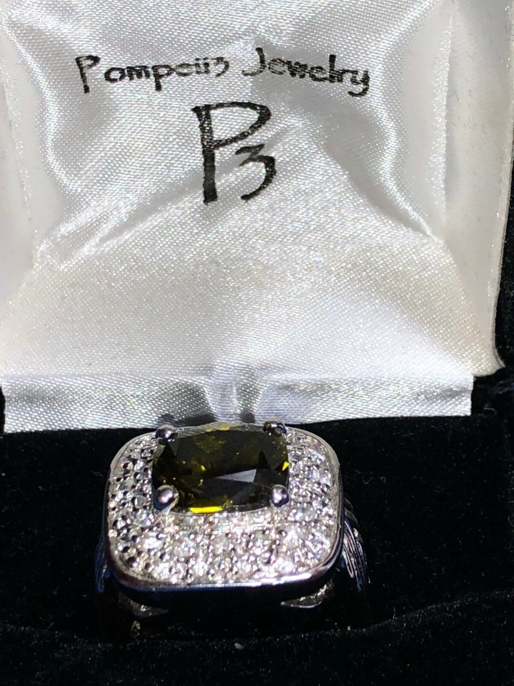 ONE RING. UNMAKRED BUT IT CAME INTO MY POSSESSION IN A POMPEII3 BOX. THE MAIN STONE LOOKS LIKE GREEN CITRINE OR GREEN CHRYSOBERYL, BUT I AM NOT AN EXPERT AND MAKE NO GUARANTEES.
