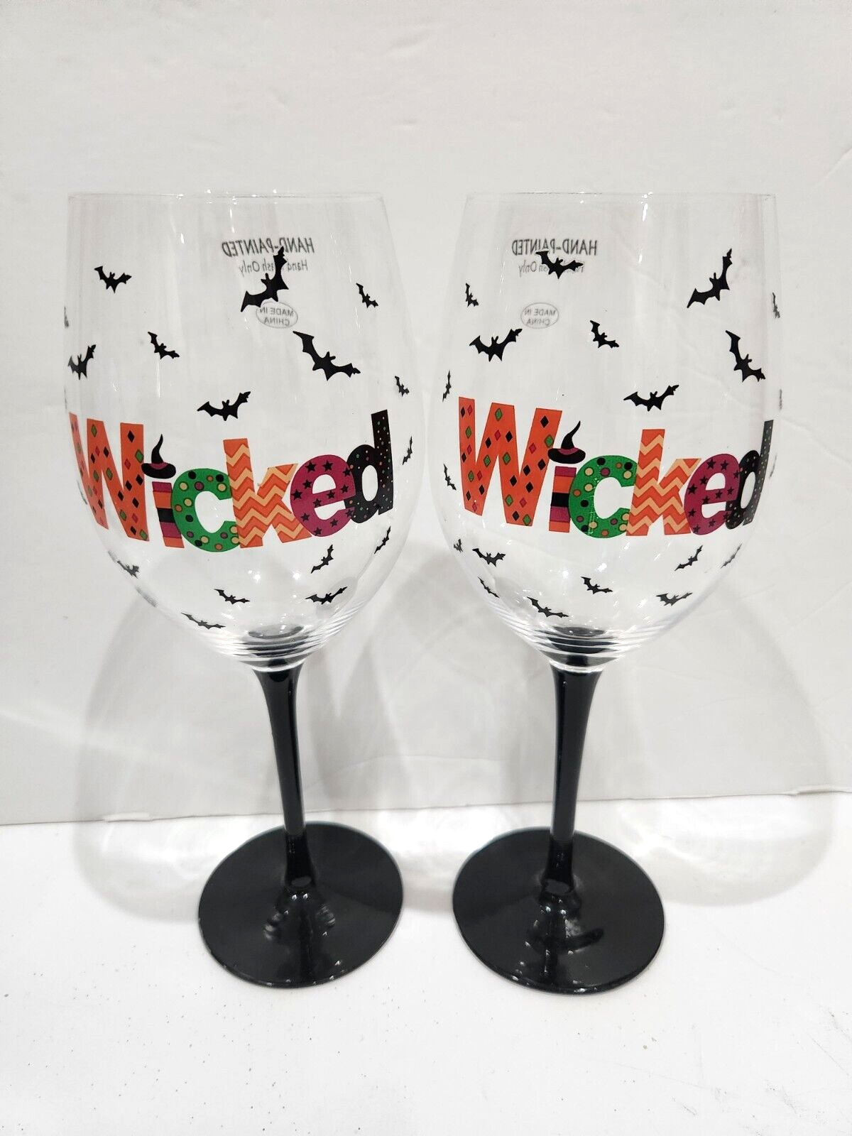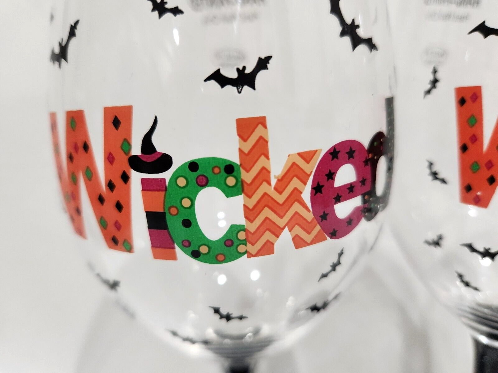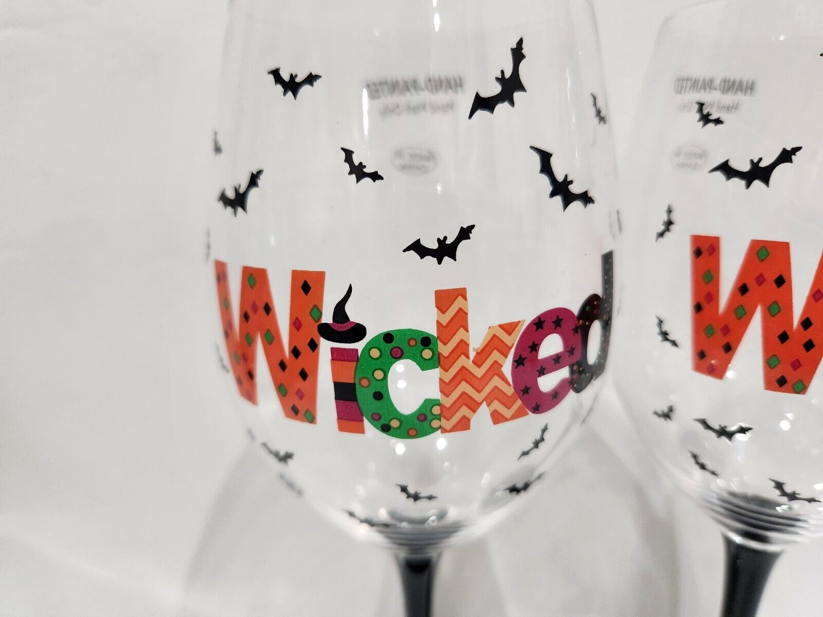 Up for sale we have these 2 amazing wine glasses for your Halloween decor. These have bats and it says "Wicked". These are new set of 2.