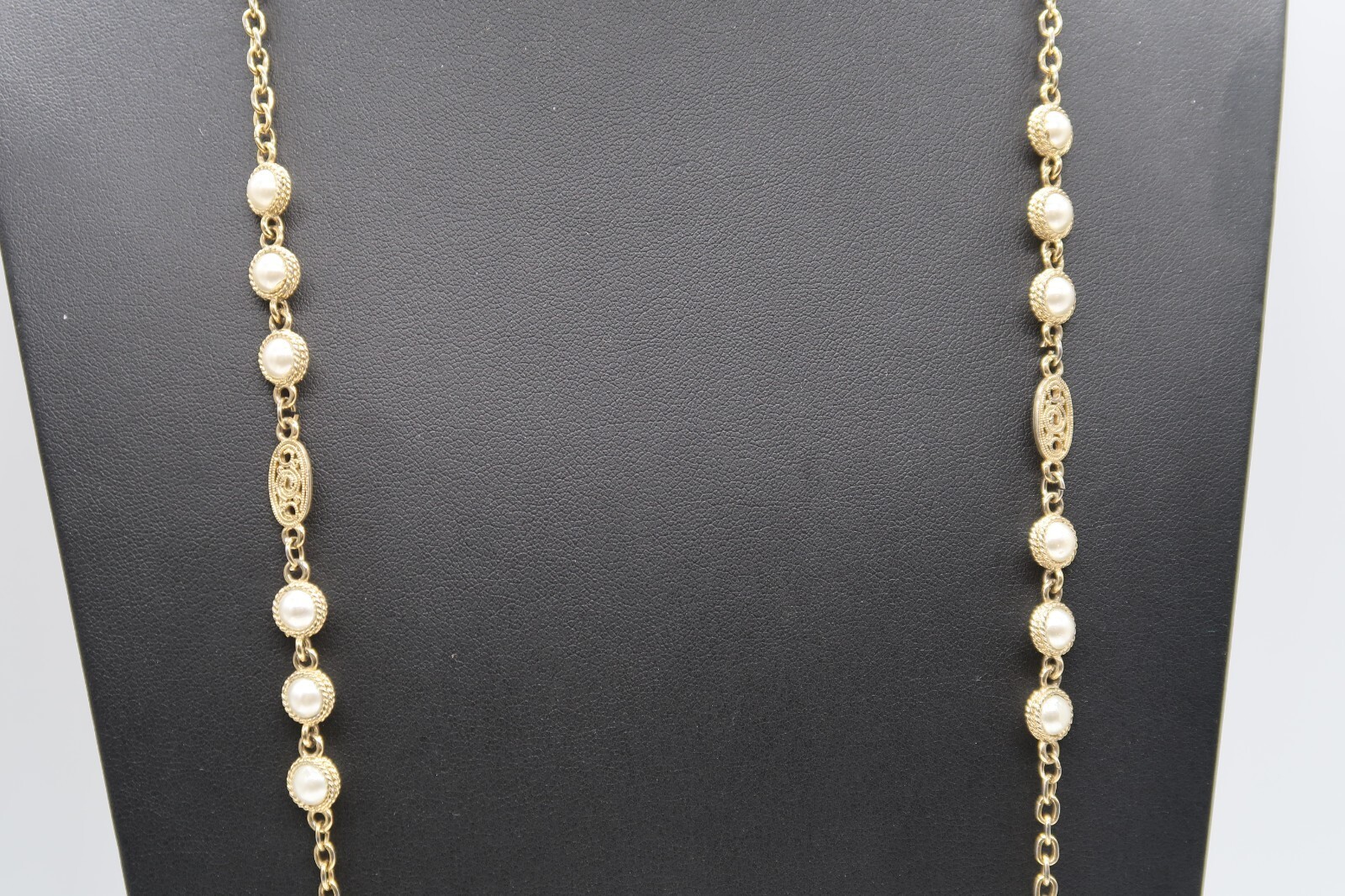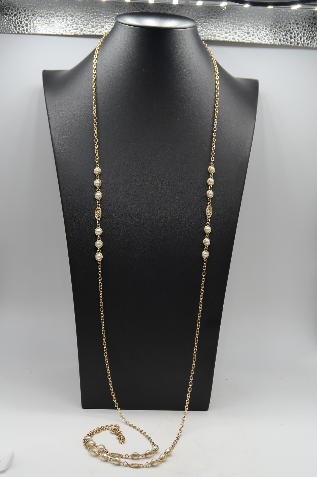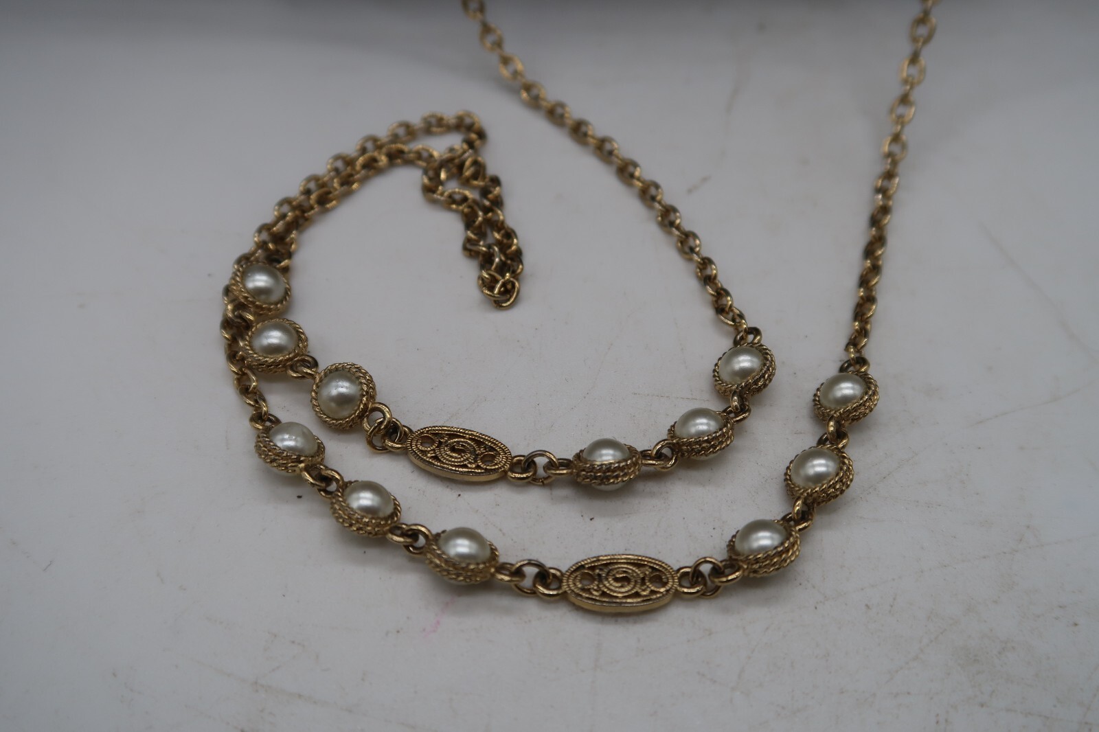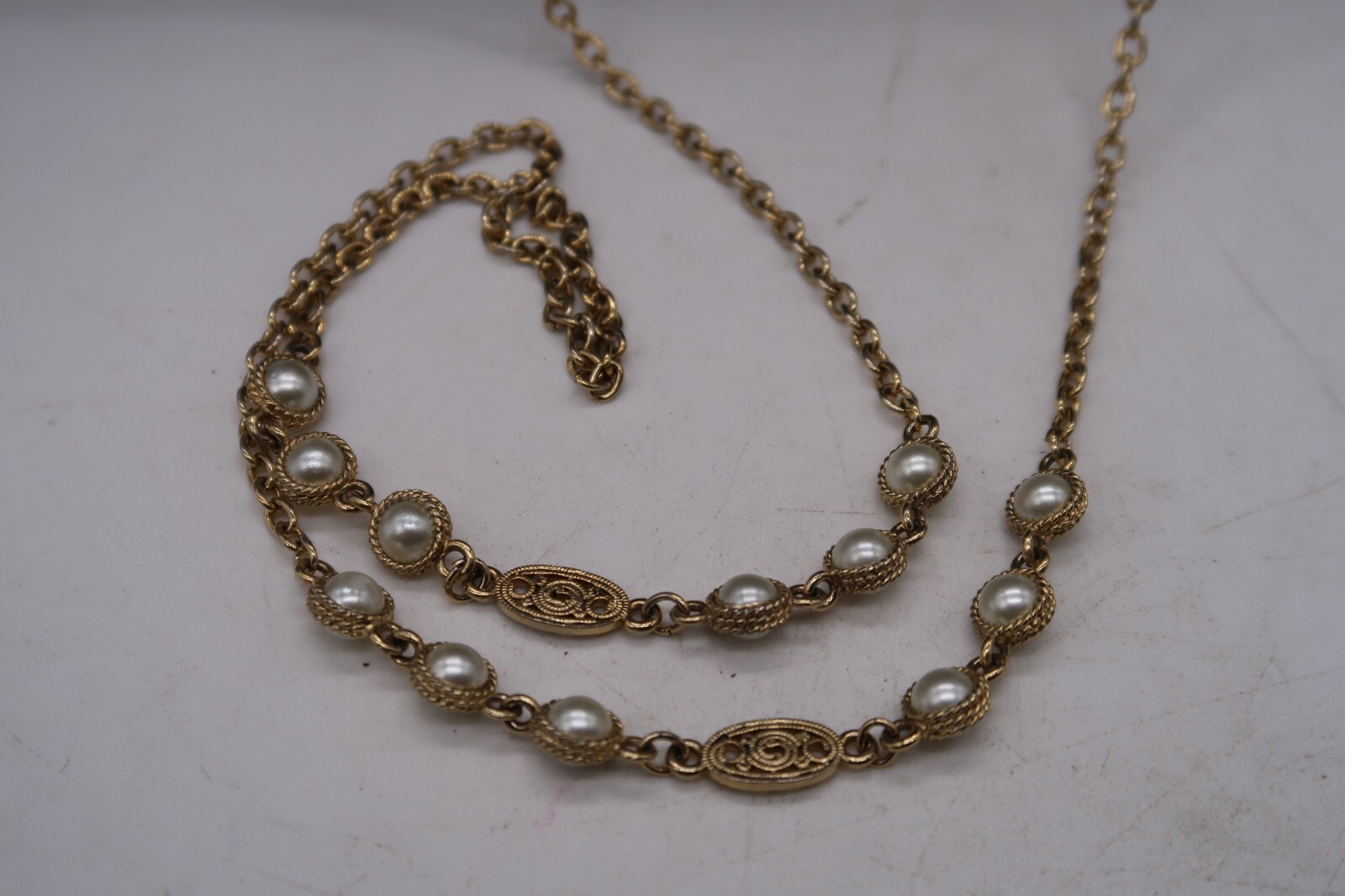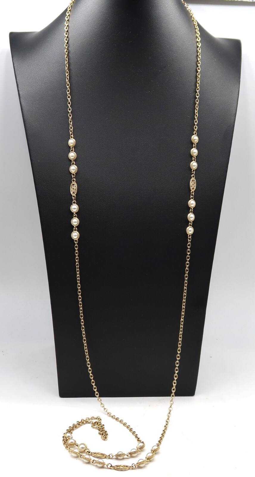 Vtg 55" Flapper Opera Length Gold Tone Faux Pearl Statement Necklace