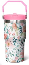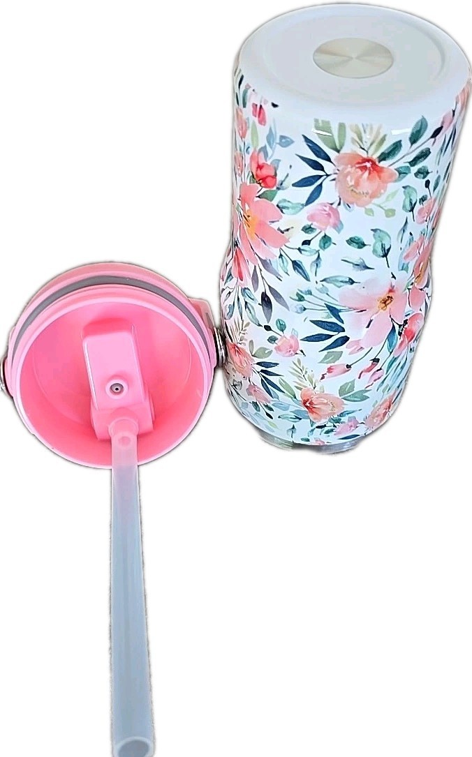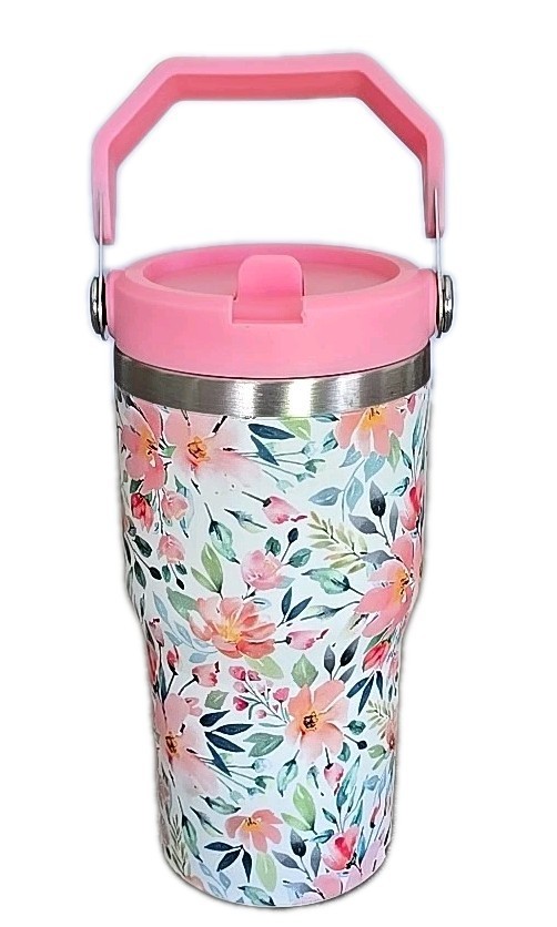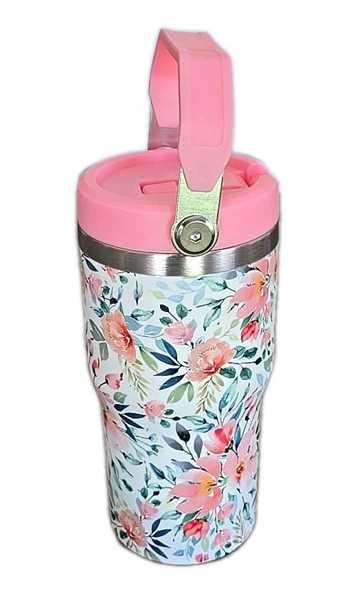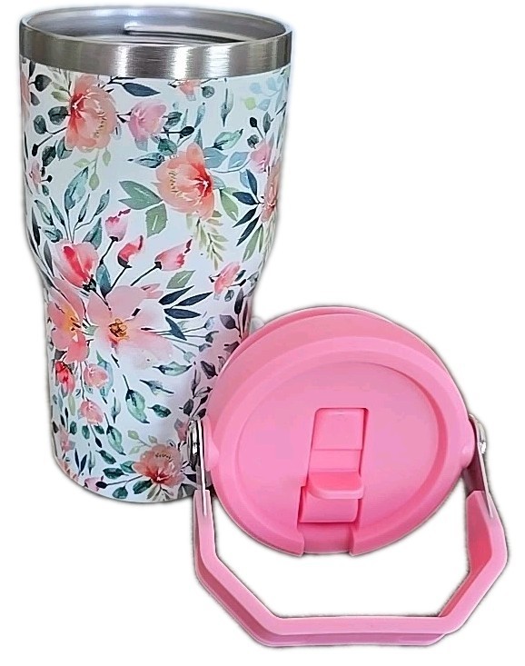 Stainless Steel 20 Oz Tumbler ~ Top Handle ~ FLORAL ~ Coffee Mug w/Flip Straw ~3