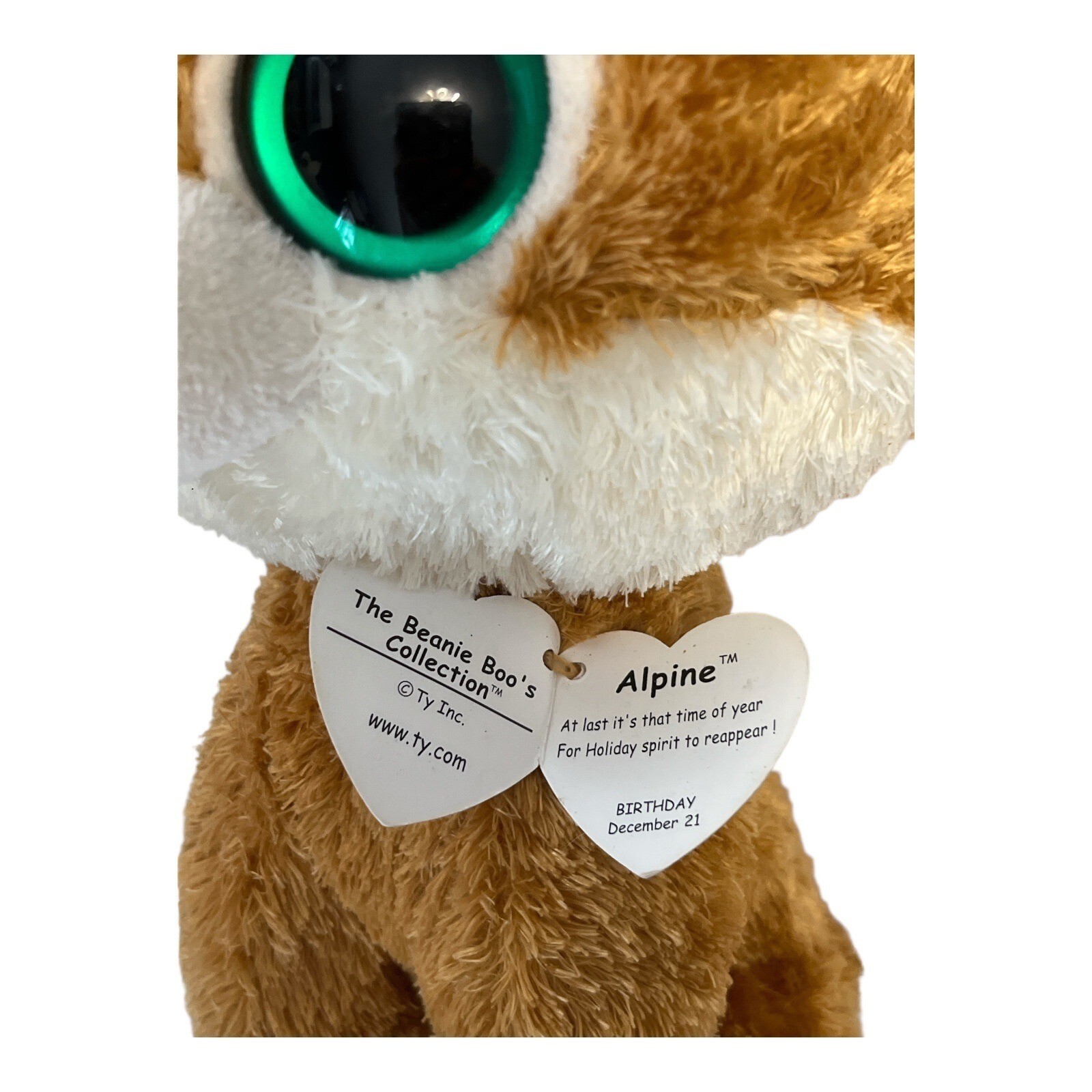 Add festive charm to your collection with this adorable Alpine the Reindeer plush from the Beanie Boos line by TY Inc. This medium-sized reindeer features glittery silver hooves, golden antlers, a bright red nose, and signature oversized green eyes. Part of the Holiday 2021 collection, Alpine is a cheerful addition to any seasonal decor or TY collection.