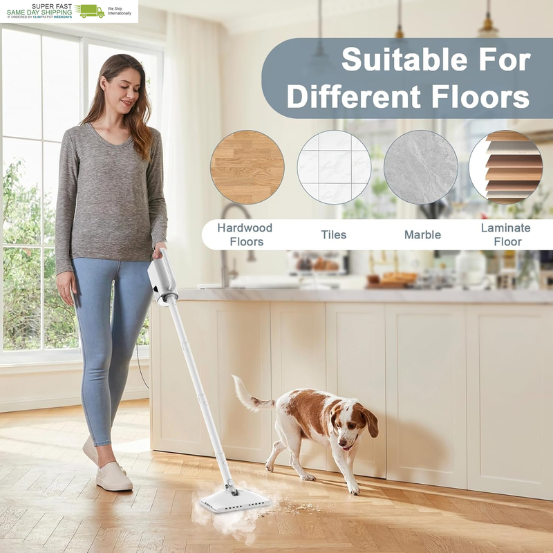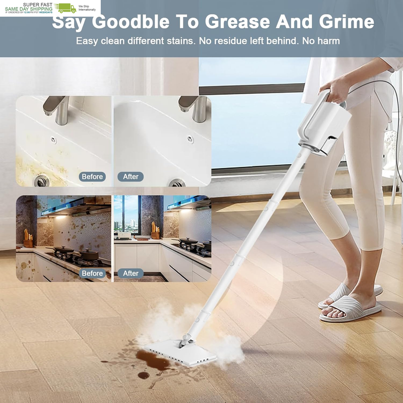 ?Multi-Functional and Replacement Heads? ?The steam mop with attachments can help you clean hardwood, laminate, marble, tile and other materials, while the 5 different replacement heads can also help you clean water stains on bathroom windows, grease stains on kitchen stoves, desktop dirt and even basic ironing can be easily done. The steam mop is a good helper for your home cleaning!
