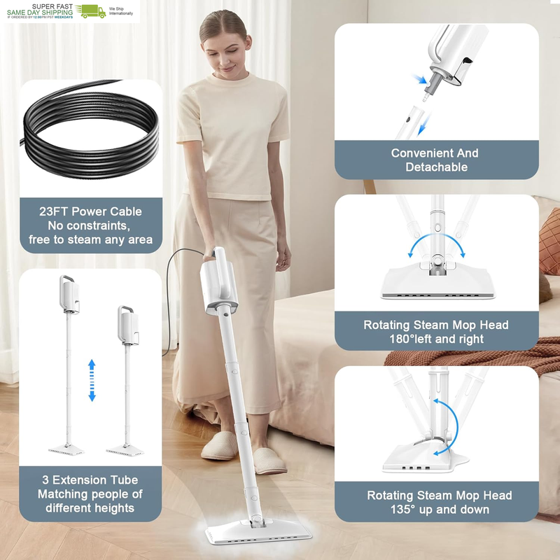 ?Adjustable and Removable, Convenienct Steam Cleaner? ?Equipped with dual cleaning modes, you can choose different mode to fit your needs. The extended 23FT power cord and rotating steam mop cleaner head. With 180-degree horizontal and 135-degree vertical rotation, make cleaning corners and edges a breeze. The three-section detachable pole adjusts to different heights, ensuring a comfortable cleaning experience without any strain.