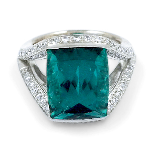 The ring features an indicolite tourmaline set within tampering diamond ribbons