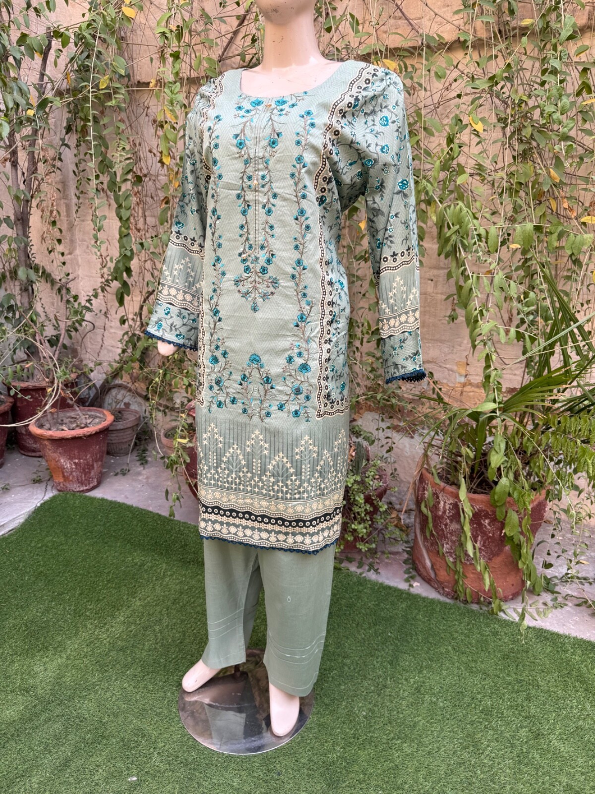 Pakistani Sage Green Printed Straight Shirt 3-PCS Lawn Suit w/ Threadwork ,XL #1