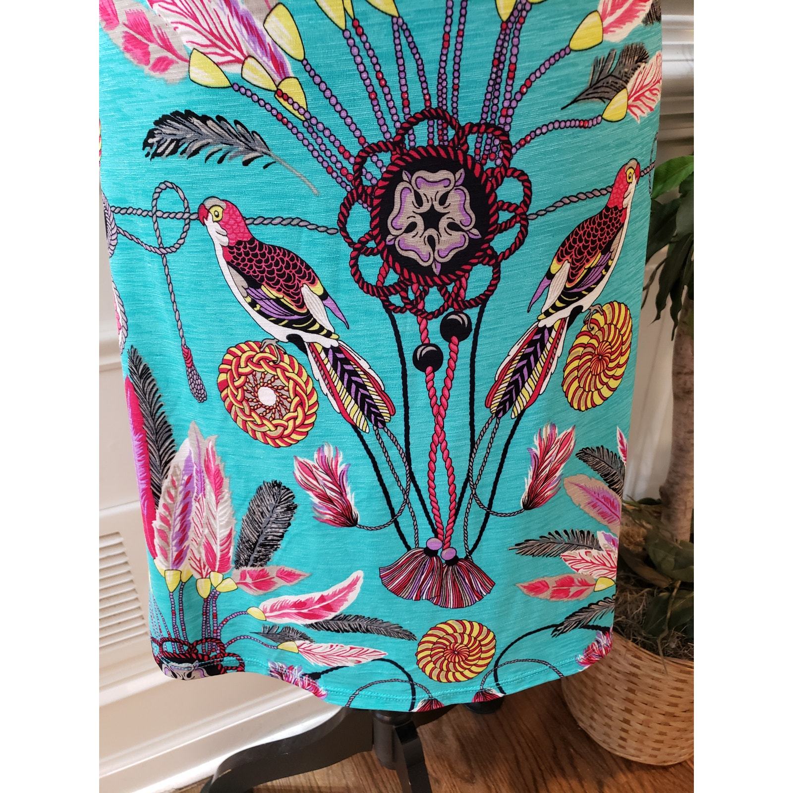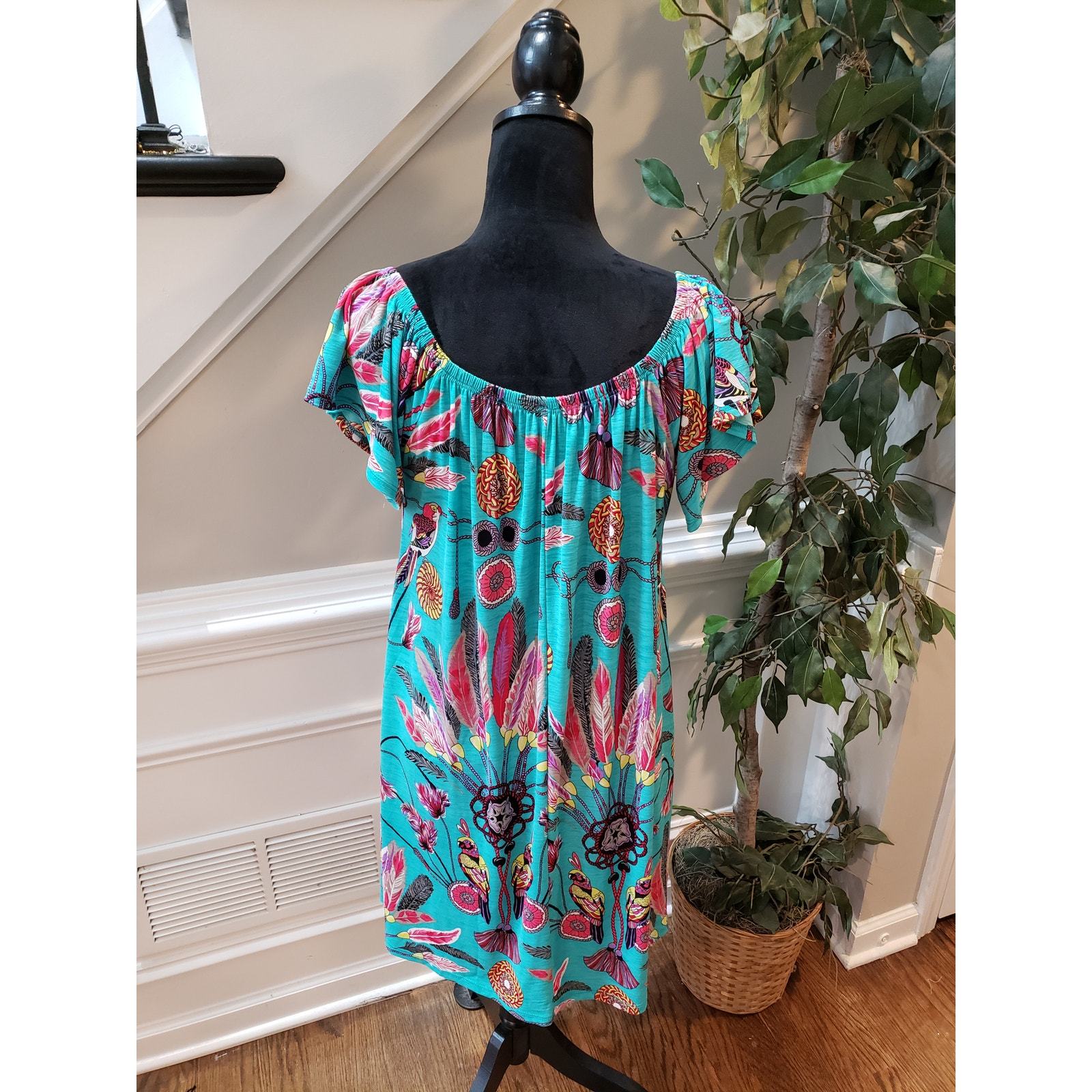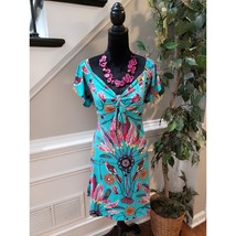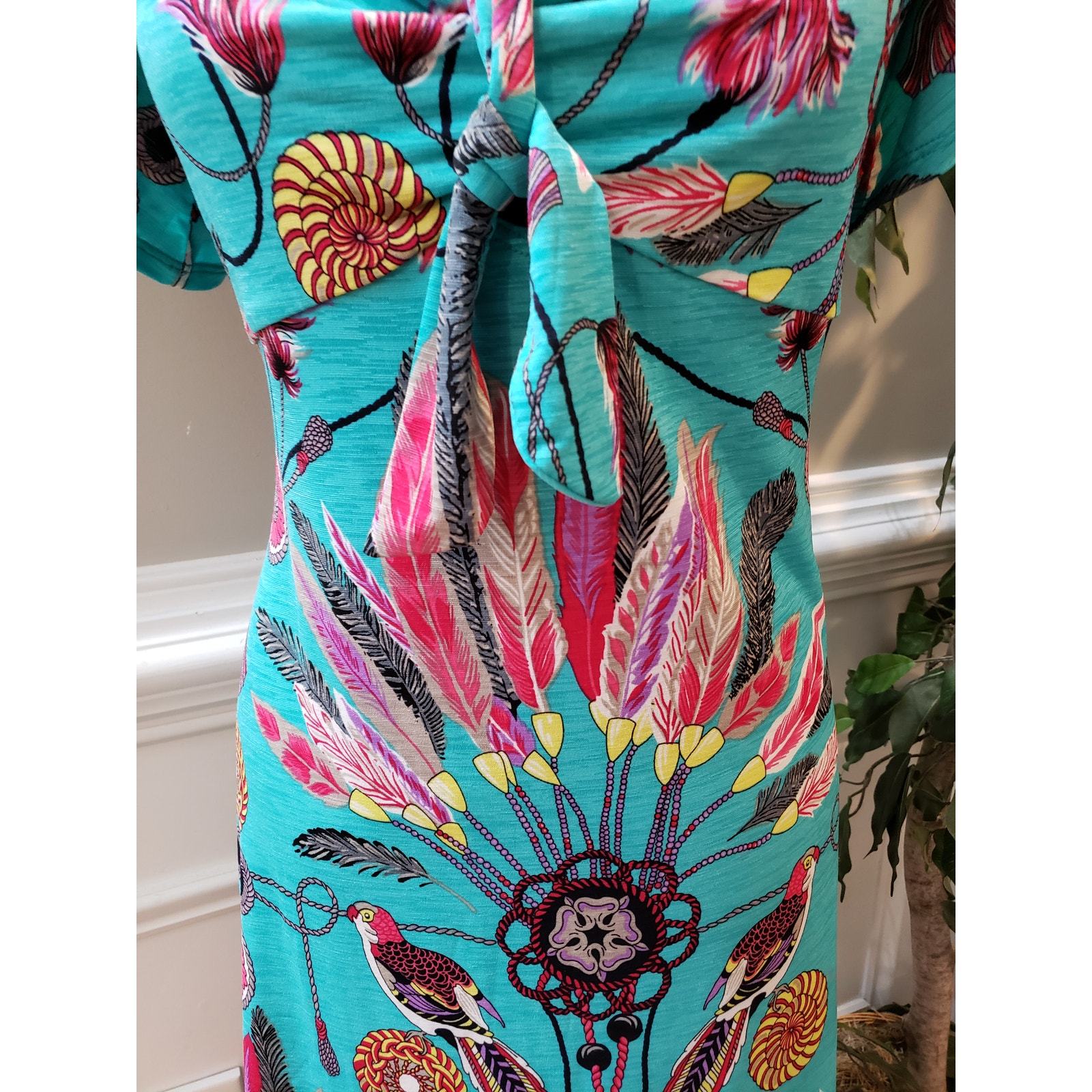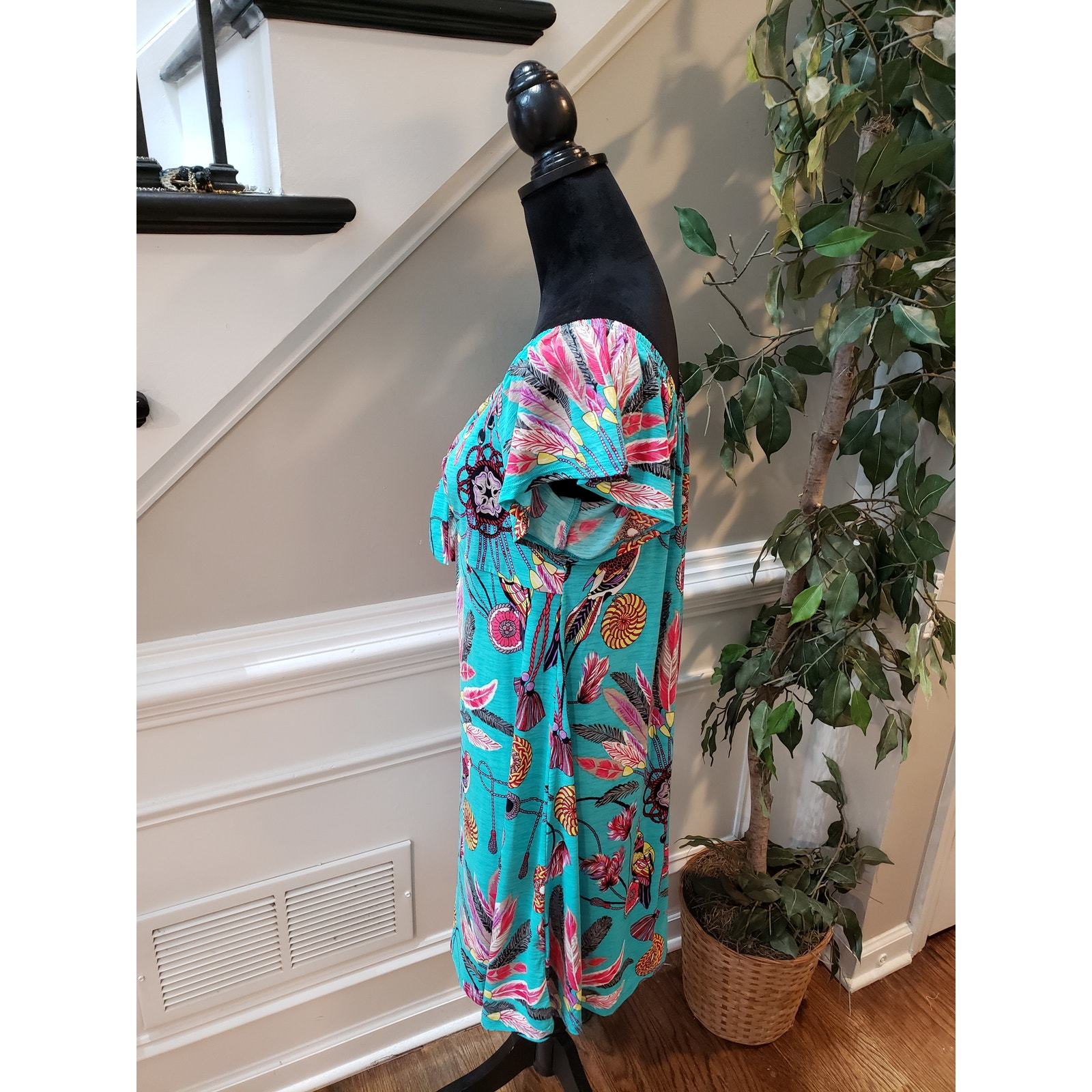 This vibrant Love Lee dress in size L features a multicolor floral and feather boho print on a blue base. Made in the USA with a stretch polyester-spandex blend, it includes a flattering tie-front bust and short sleeves. Perfect for casual summer days, beachwear, or vacation looks.