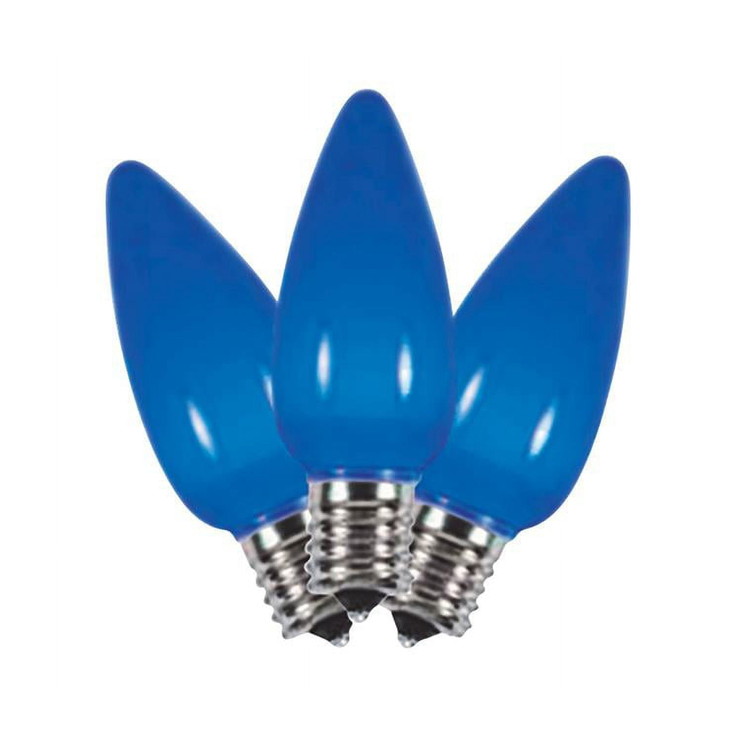Features 40 percent brighter, equivalent to 7 diodes Last longer Pack of 25 Specifications Bulb Type: LED C9 Style: Smooth Ceramic Bulb Color: Blue Lighted Length: 2 in. Number of Lights: 25 lights Flashing: No UL Listed: Yes Watts: 0.6 watts Indoor or Outdoor: Indoor and Outdoor Weather Resistant: Yes SMD LED Technology that illuminates all areas of the bulb Weight: 1.46 lbs