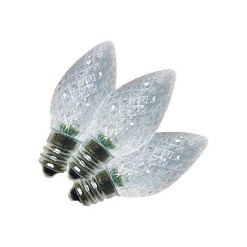 Features BX25 Christmas LED Replacement Bulb C7 LED Bulb Bulb Color: Cool White Voltage: 120 volts Wattage: 0.6 watts Material Type: Acrylic LED Indoor and Outdoor: Indoor and Outdoor SMD technology illuminates all areas of the bulb 40% brighter, equivalent to 7 diodes which last longer Box of 25 Specifications Dimension: 4.5 H x 4.9 W x 2.4 L Weight: 0.7 lbs