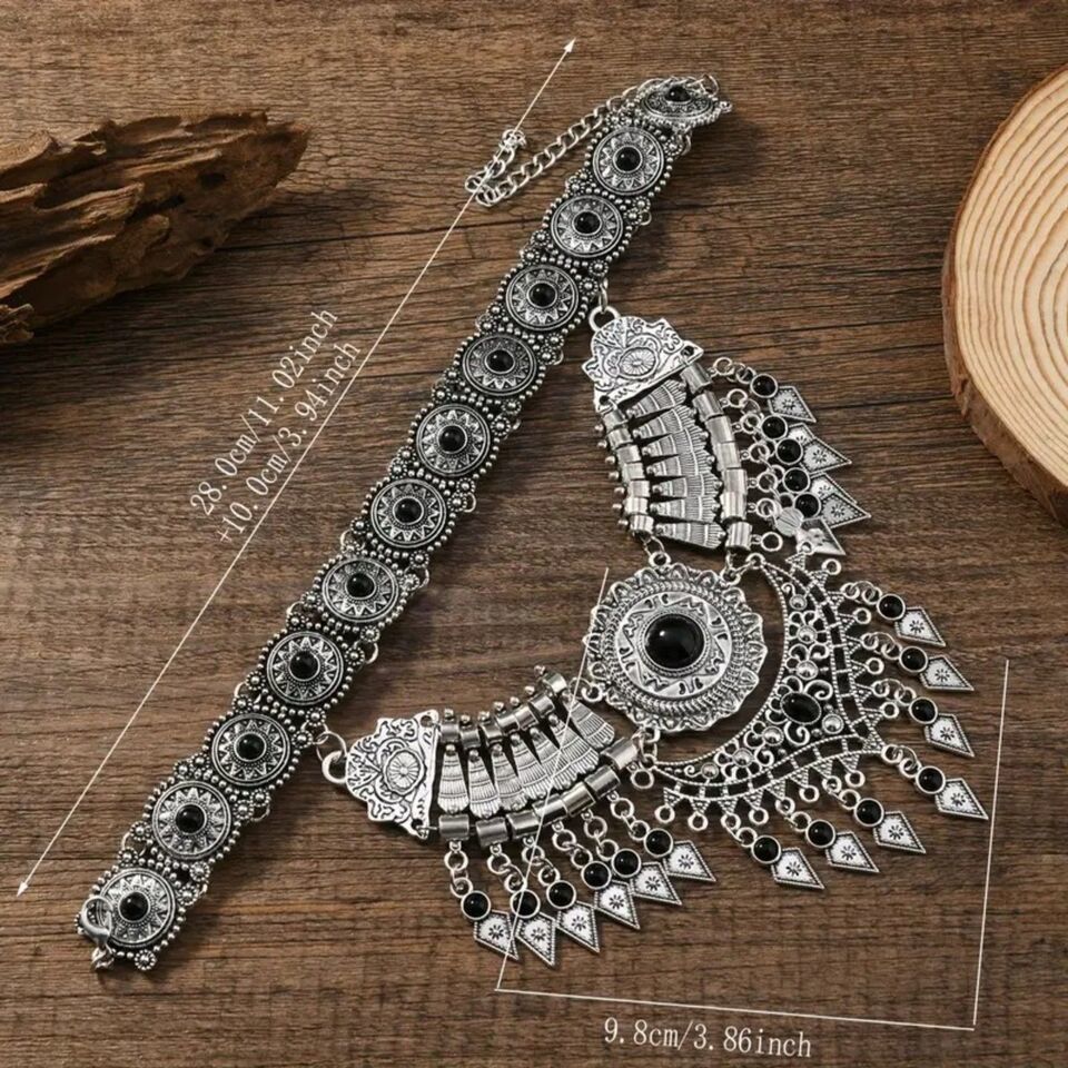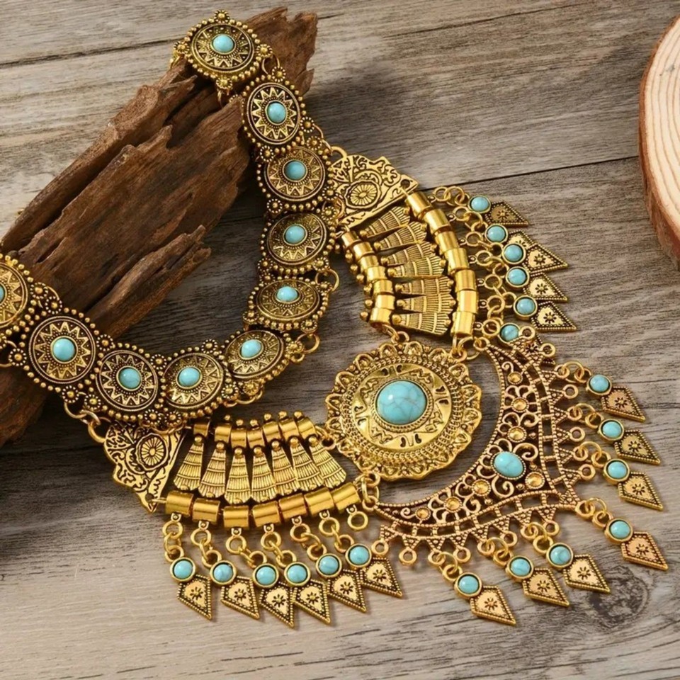 Make a bold statement with this stunning Bohemian Layered Necklace Set, featuring an intricate antique gold-tone finish with vibrant turquoise stone accents. This two-piece design includes a detailed choker with circular medallions and an elaborate bib necklace, adorned with tribal-inspired etchings, metal fringe, and dangling geometric charms. Perfect for festivals, boho-chic outfits, or making a regal fashion statement. Crafted from durable alloy, this set is lightweight yet striking, with an adjustable chain for a comfortable fit.