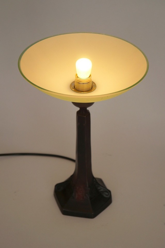 Unique Art Deco Table Flooder "Garden Green". Black anodized brass cast gear with beautiful patina and light signs of age and wear. Two-layer opal glass with great lighting effect, smaller scratches in the matting (see detailed photos). Total height approx. 30 cm, umbrella diameter approx. 20 cm. Completely renewed electrical installation. PVC supply line with cord intermediate switch. New E14 standard version, up to max. 40 watts - we strongly recommend LED lamps! Small parts such as screws or washers have been renewed. Sale without decoration and lamp! Shipping within Germany free of charge! Please note: All of our luminaires were brought into circulation well before 2005, are in their original condition and therefore do not fall under the electrical and electronic device law (WEEE guideline of the EU).