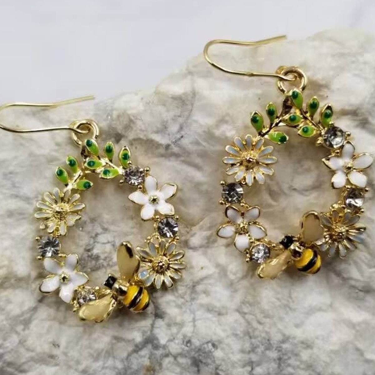 Crystal Flower and Enamel Bee Dangle Earrings and similar items