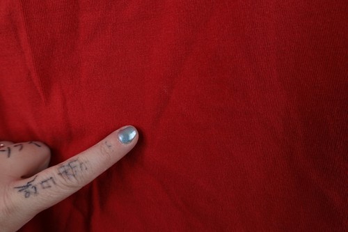 Stains front, back, both arms. Hole left arm. Graphics cracking and faded. Back frayed. Color faded