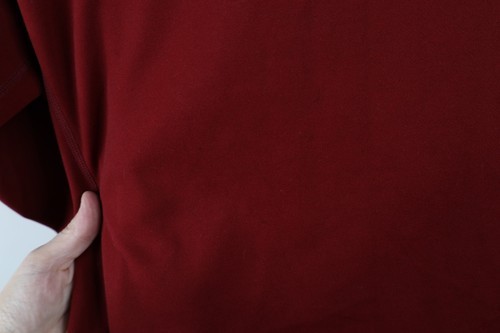 Blemishes and fabric pulls front and back. Material stuck in left sleeve fabric