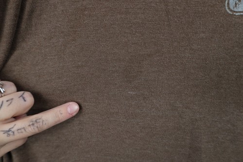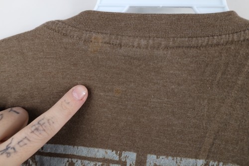 Blemishes left side, back top. Dark spots on front. Graphics distressed. Color fade. Baggy fit