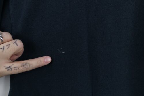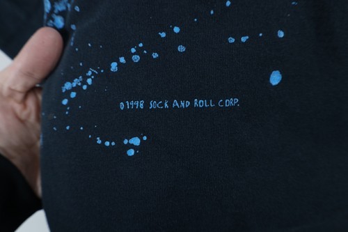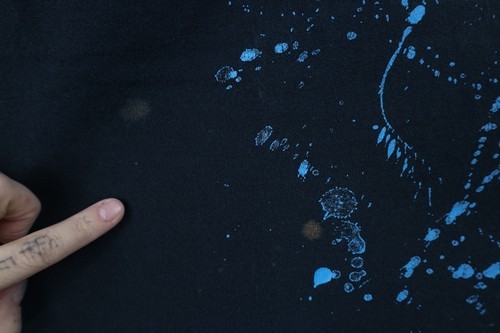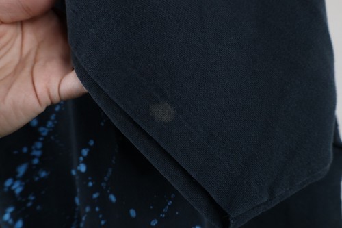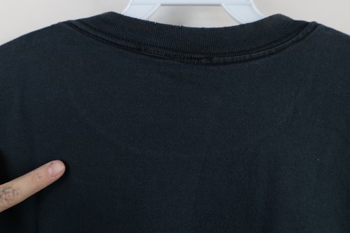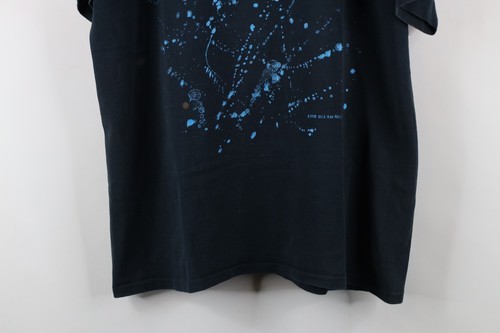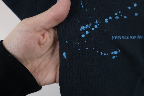 Stains front, back, left arm. Holes along collar. Graphics faded. Color faded. USA made