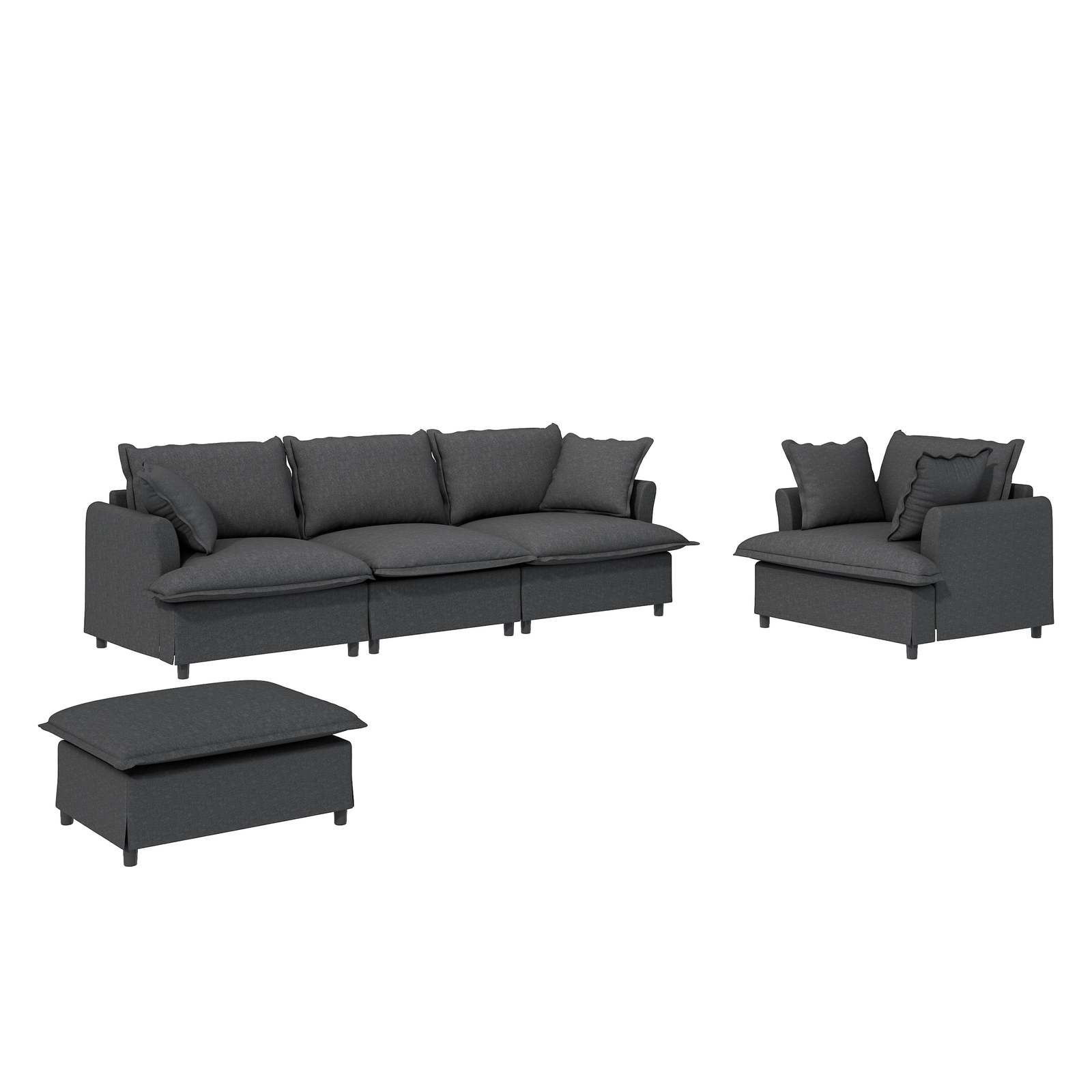 Discover endless possibilities with our modular sofa! Featuring three movable modules?three-seater, single seat, and ottoman?you can easily customize the layout to fit any space. Need more? Simply purchase additional modules as needed. Perfect for various room sizes and interior styles, its elegant skirted seat design and petal-shaped armrests bring a touch of sophistication to your home. Enjoy versatile, stylish comfort with our adaptable, modular design!
