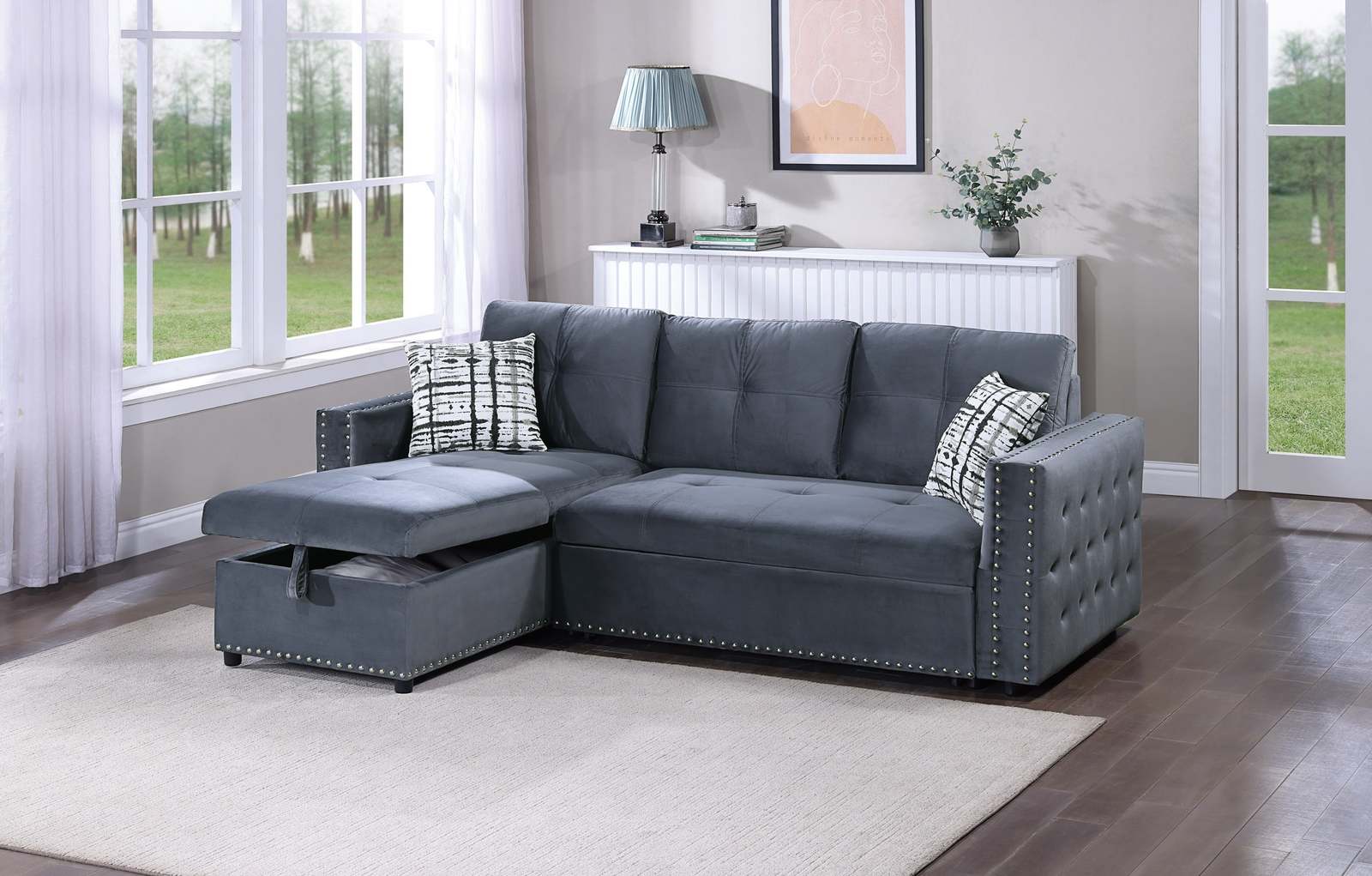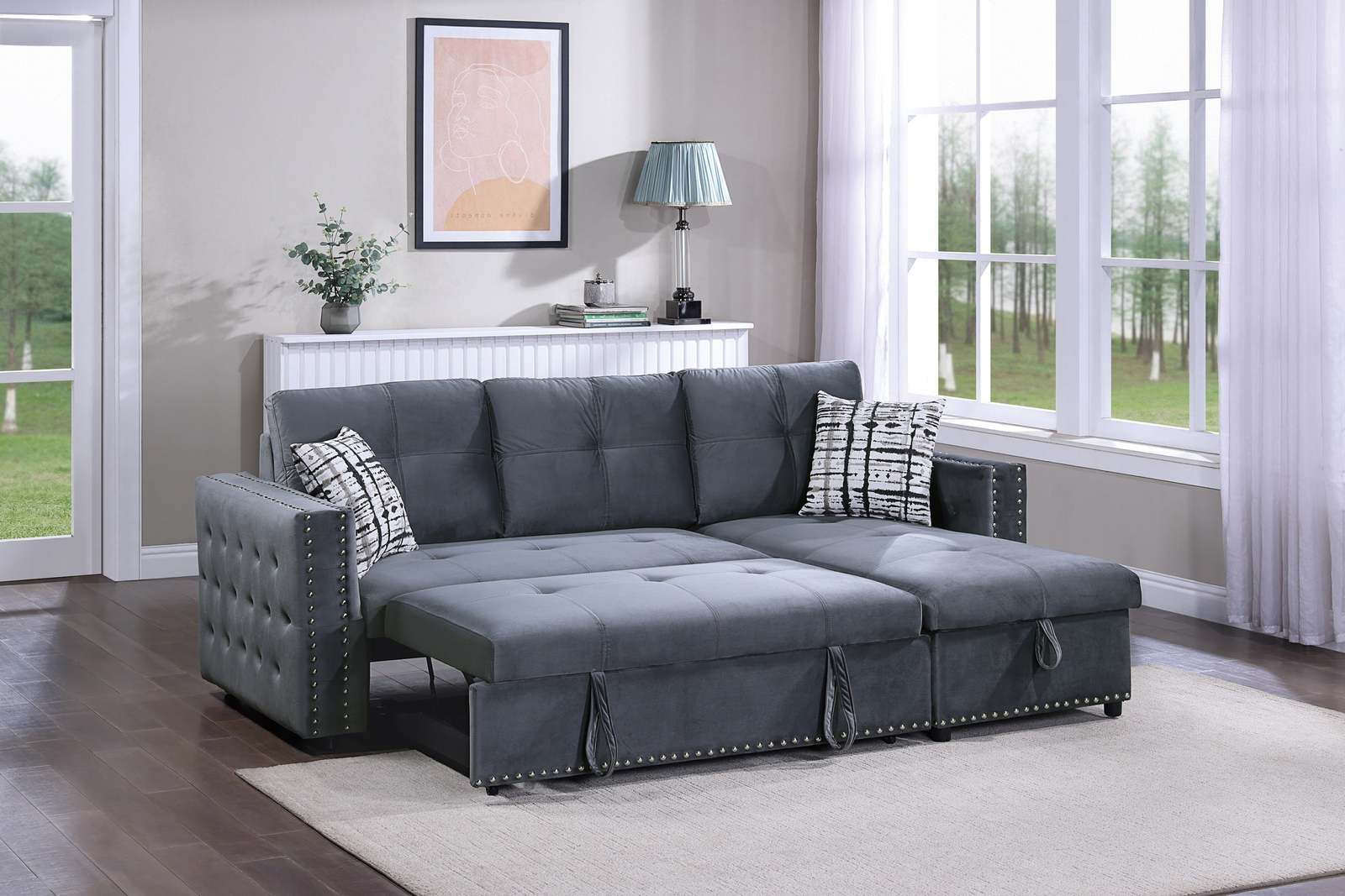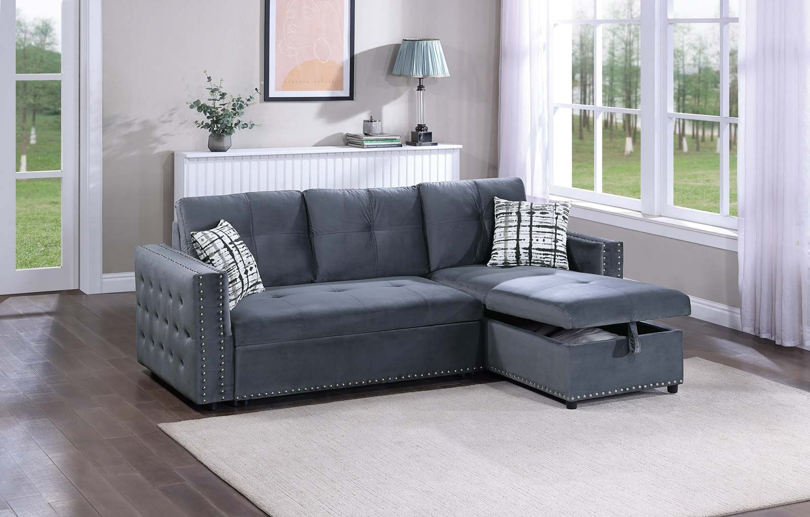 This exceptional piece seamlessly combines comfort, functionality, and contemporary design to elevate your living space. Choose the configuration that suits your space and preferences with the reversible chaise. The reversible chaise is not just a comfortable lounging spot ? it also features convenient storage underneath. Keep your living space organized and clutter-free with this hidden storage compartment, perfect for blankets, pillows, or any other essentials. Enjoy the luxury of tufted seats and back cushions that not only provide plush comfort but also add a touch of sophistication to your decor. The square arms are adorned with nail head trim, adding a touch of elegance to the overall design. Diamond button tufting on the side further enhances the aesthetic appeal. To complete the look, we've included two accent pillows with captivating designs. These pillows add a pop of color and personality to your sectional, creating a cohesive and stylish living space.