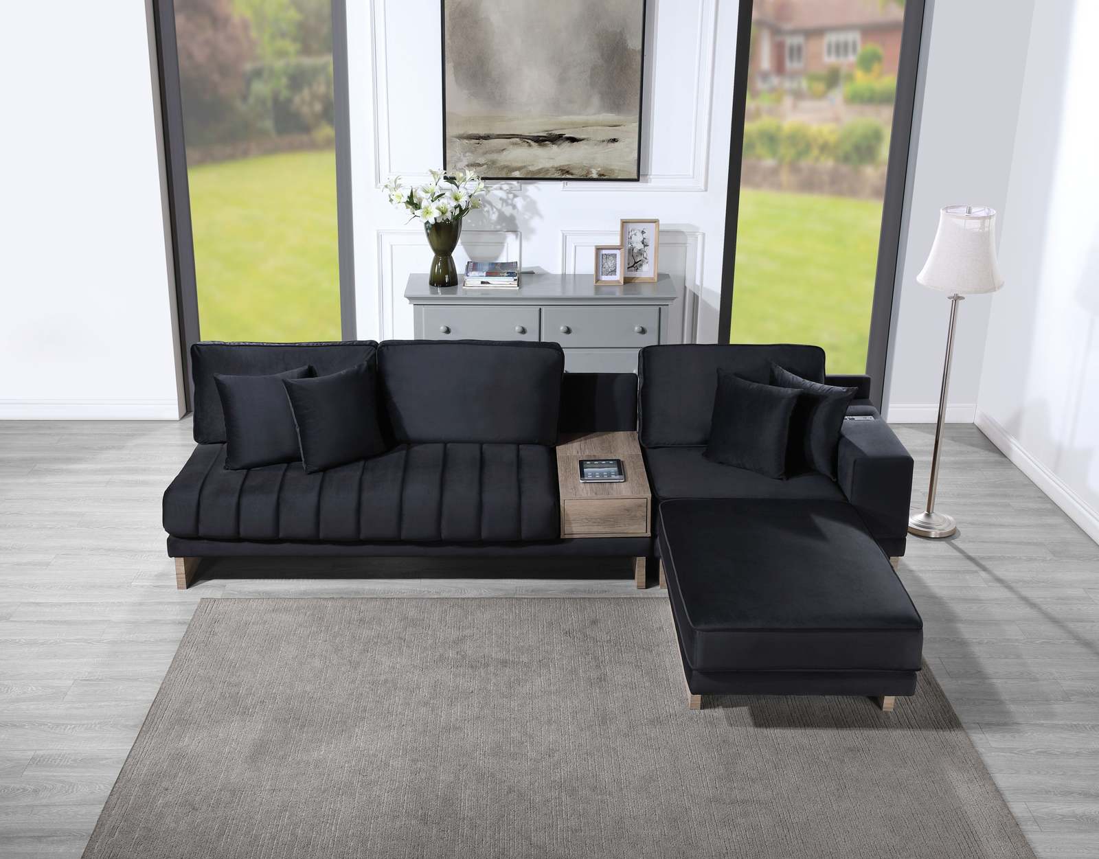Black Velvet Sectional Sofa w/ Storage & USB