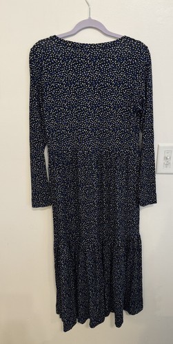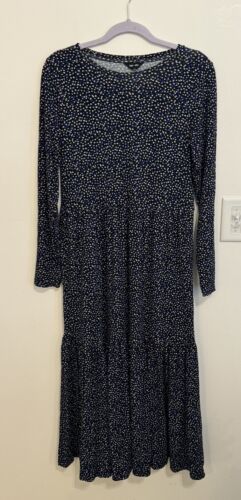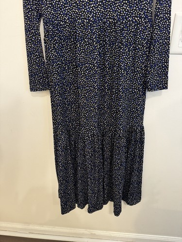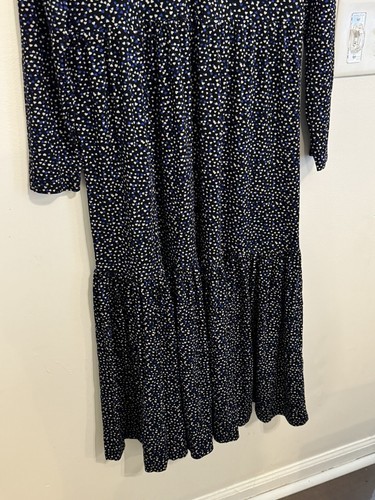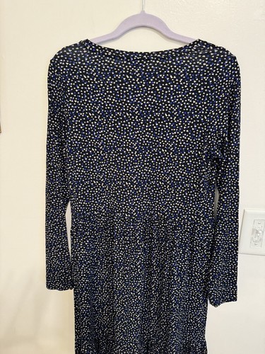 For sale is a Saint + Sofia Women's Long Sleeve Knit Heart Print Smock Shirt Dress. Black fabric with blue and beige hearts all over.