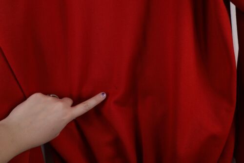 Has stains on back bottom and left arm cuff and fabric pull on right arm. USA made