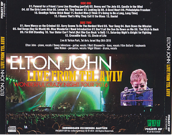 Elton John Live in Tel Aviv, Israel Soundboard Wonderful Crazy Night Tour 2016. Recorded at Yarkon Park on May 26, 2016 2 CD. Must own for any Elton John fan!