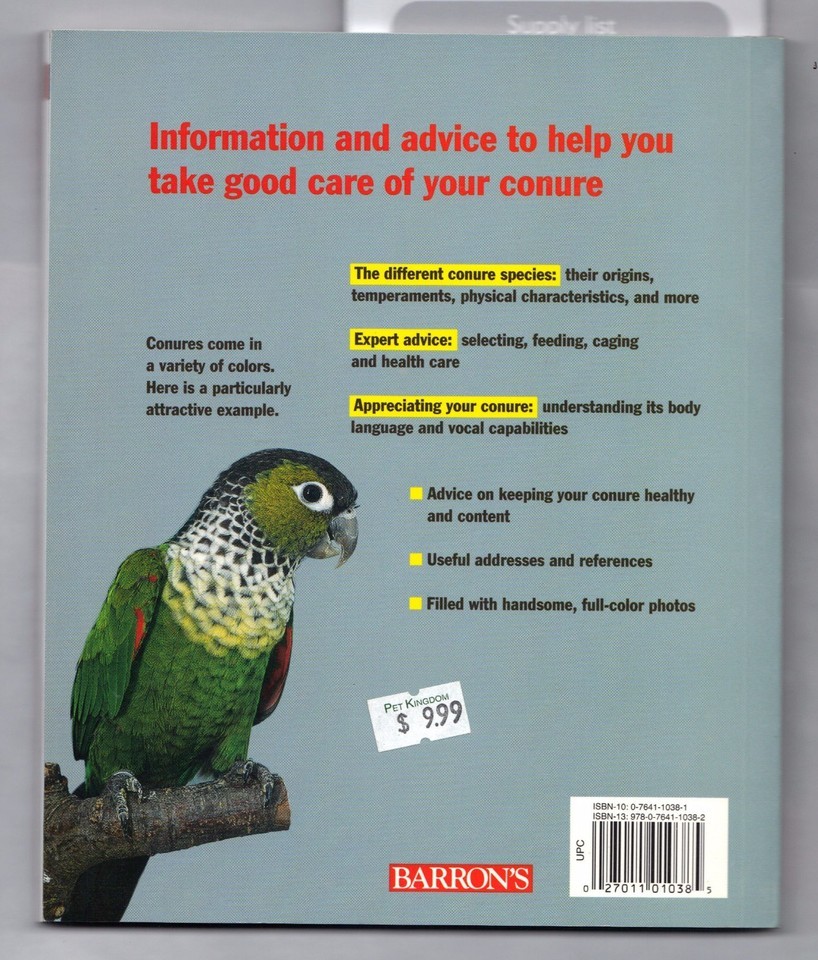 For Sale is a Rare and hard to find Barron's Complete Pet Owner's Manuals Ser.: Conures by Matthew M. Vriends (2000, Paperback) RARE OOP. Its in Good USED condition as can be seen from the pictures provided. Please ask Any and All Questions prior to purchasing. Fast Same or Next day shipping with Free Delivery Confirmation within the U.S. Payment Due within 7 days of purchase (if you need more time please let us know In advance) we love to combine shipping is always a Yes and Most of the time Additional Items Ship for free. SKU4MS