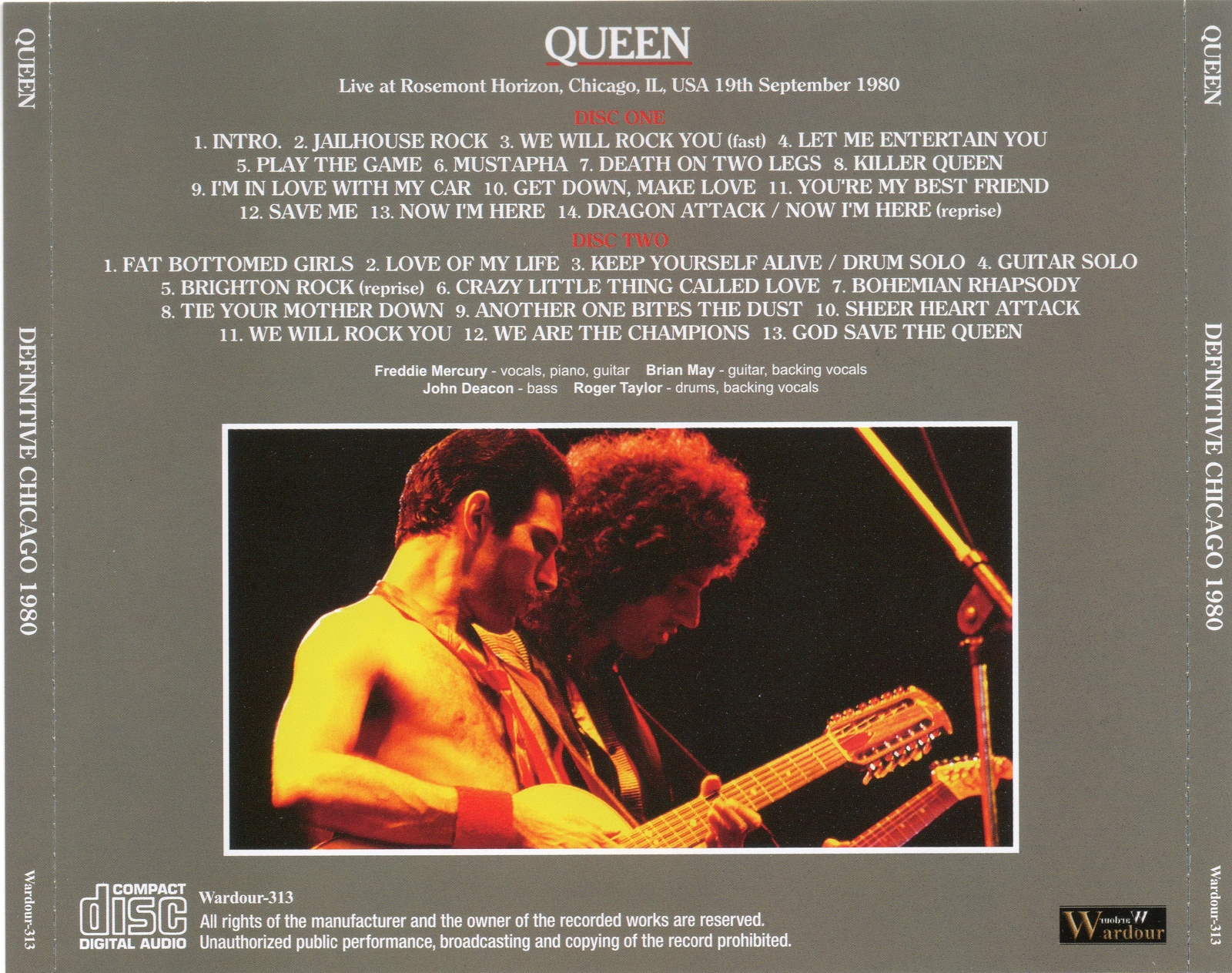 Queen Definitive Chicago 1980 CD Rosemont Horizon, Illinois September 19, 1980. Good sounding audience tape recording from Rosemont Horizon, Chicago, IL, USA on September 19, 1980.