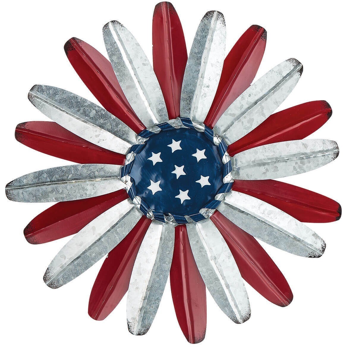 Exclusively crafted of durable galvanized metal with twisted metal detailing, a starry blue center and 3D petals in silver and red.