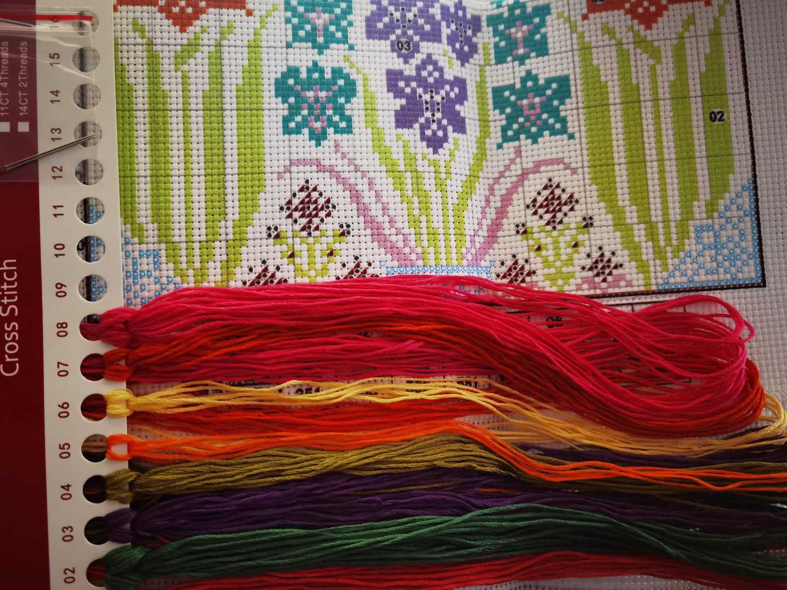 This cross stitch kit contains: 11 count stamped canvas + pre sorted threads + 2 needles + colorful chart in English.