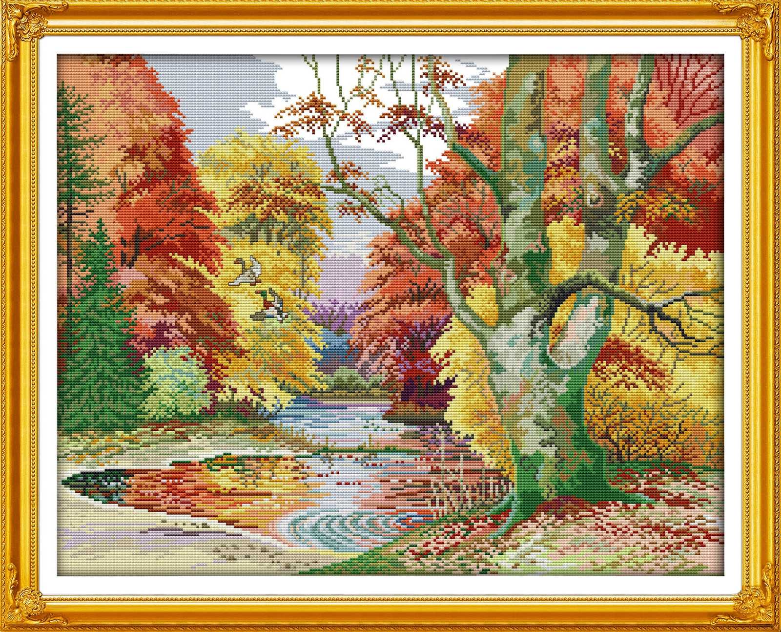 14CT Counted Cross Stitch Kit Embroidery Kit Winter River Forest Red Yellow Tree Autumn