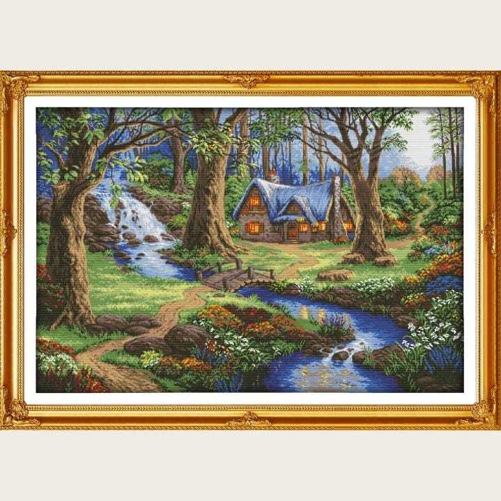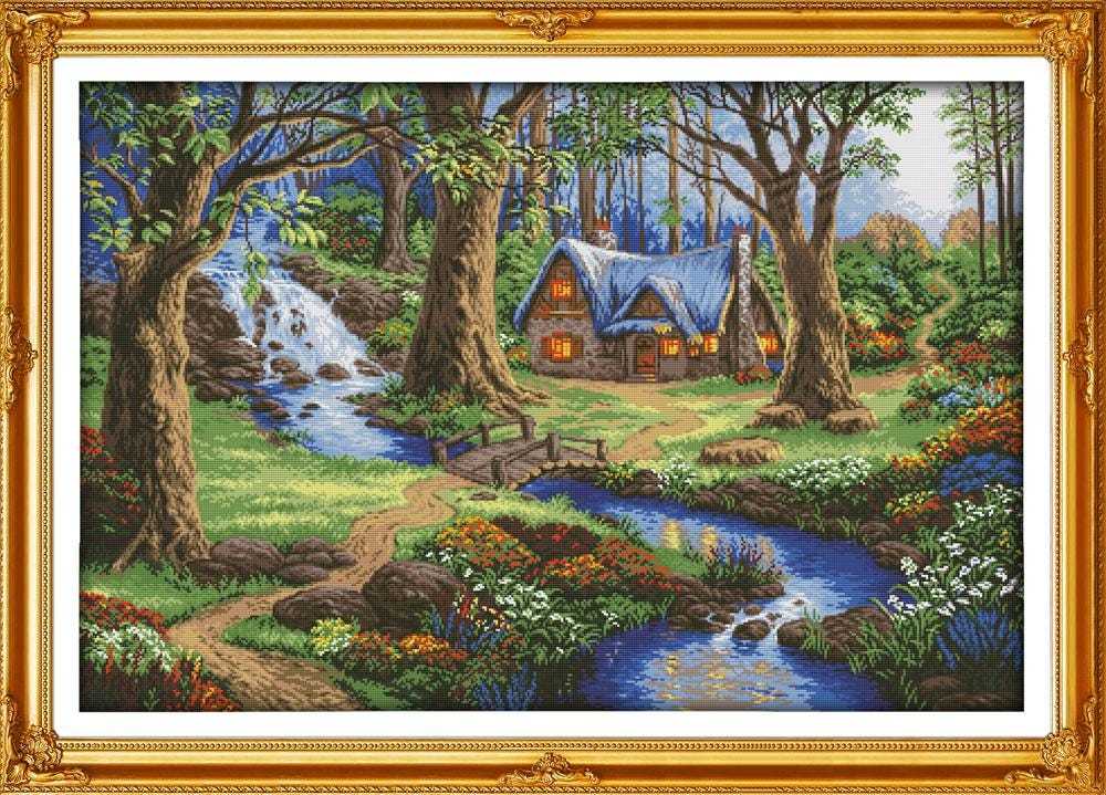 Large 14CT Counted Cross Stitch Kit Embroidery Kit The Cabin In The Forest Water
