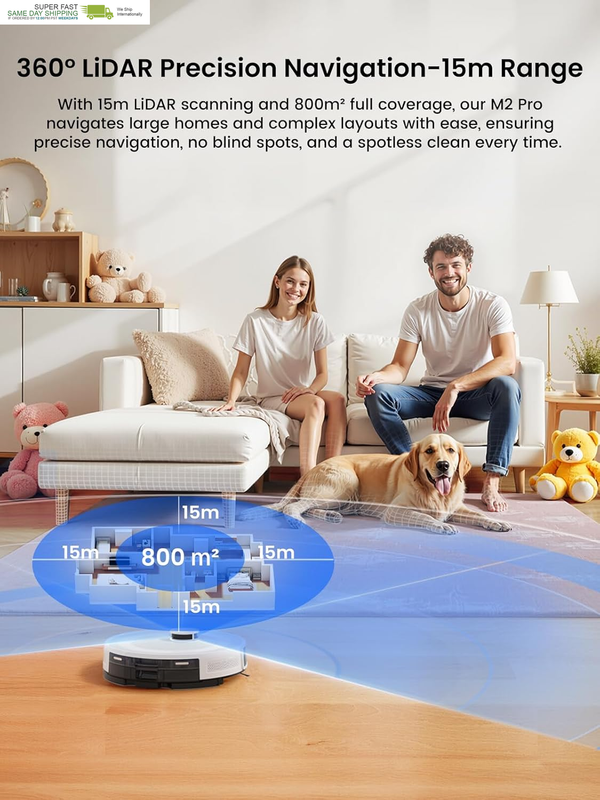 ?Long-Lasting 3200mAh Battery?Powered by a 3200mAh battery, the M2 Pro supports up to 140 minutes of continuous cleaning on a single charge, making it ideal for large homes. It automatically returns to its charging station when cleaning is complete or the battery is low.