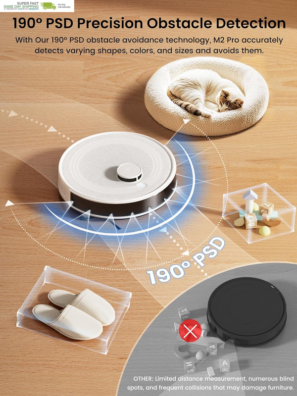 ?Precision Detection Avoidance Pet-Friendly Design?The Lefant laser robot vacuum cleaner features nine triangulation distance sensors and a 190 wide detection angle, powered by advanced PSD technology. It accurately detects and avoids objects as close as 1.6 inches away, ensuring better collision prevention and maintaining cleanliness, even in the dark. Designed specifically for pet owners, the M2 Pro effectively removes pet hair and prevents getting stuck, making it the ideal solution for a hassle-free, thorough clean.