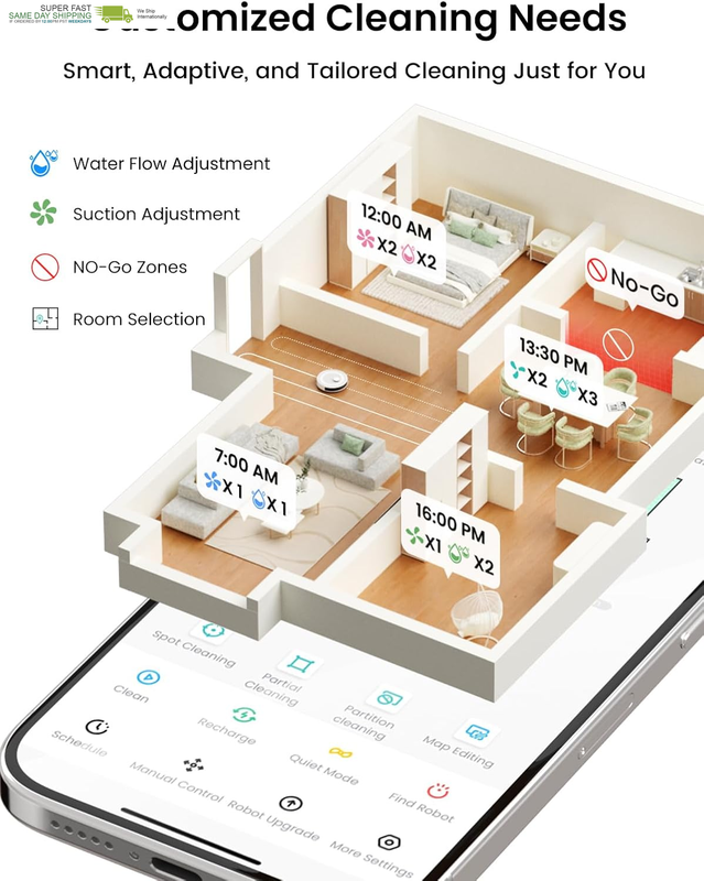?Customized Cleaning Options?With the Lefant APP, the M2 Pro offers personalized cleaning options to suit your needs: ?Cleaning Customization: Set cleaning modes and frequencies for each room. ?Selective Area Cleaning: Choose specific rooms or zones to clean. ?Zone Editing: Split or merge rooms for personalized cleaning schedules. Enjoy a smarter, more flexible cleaning experience with total control at your fingertips.