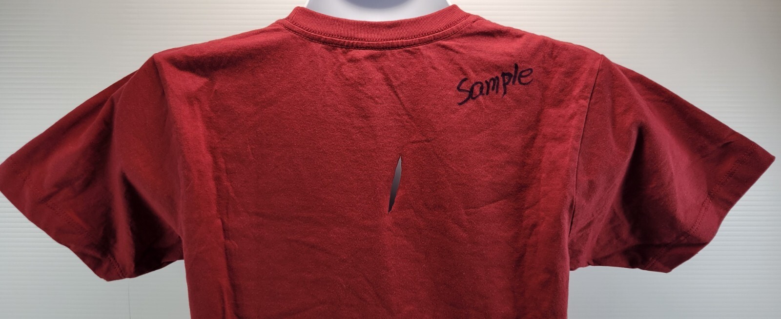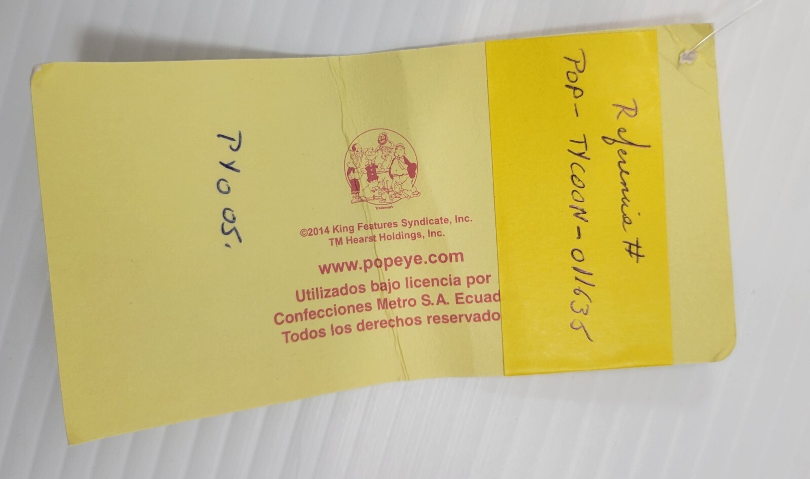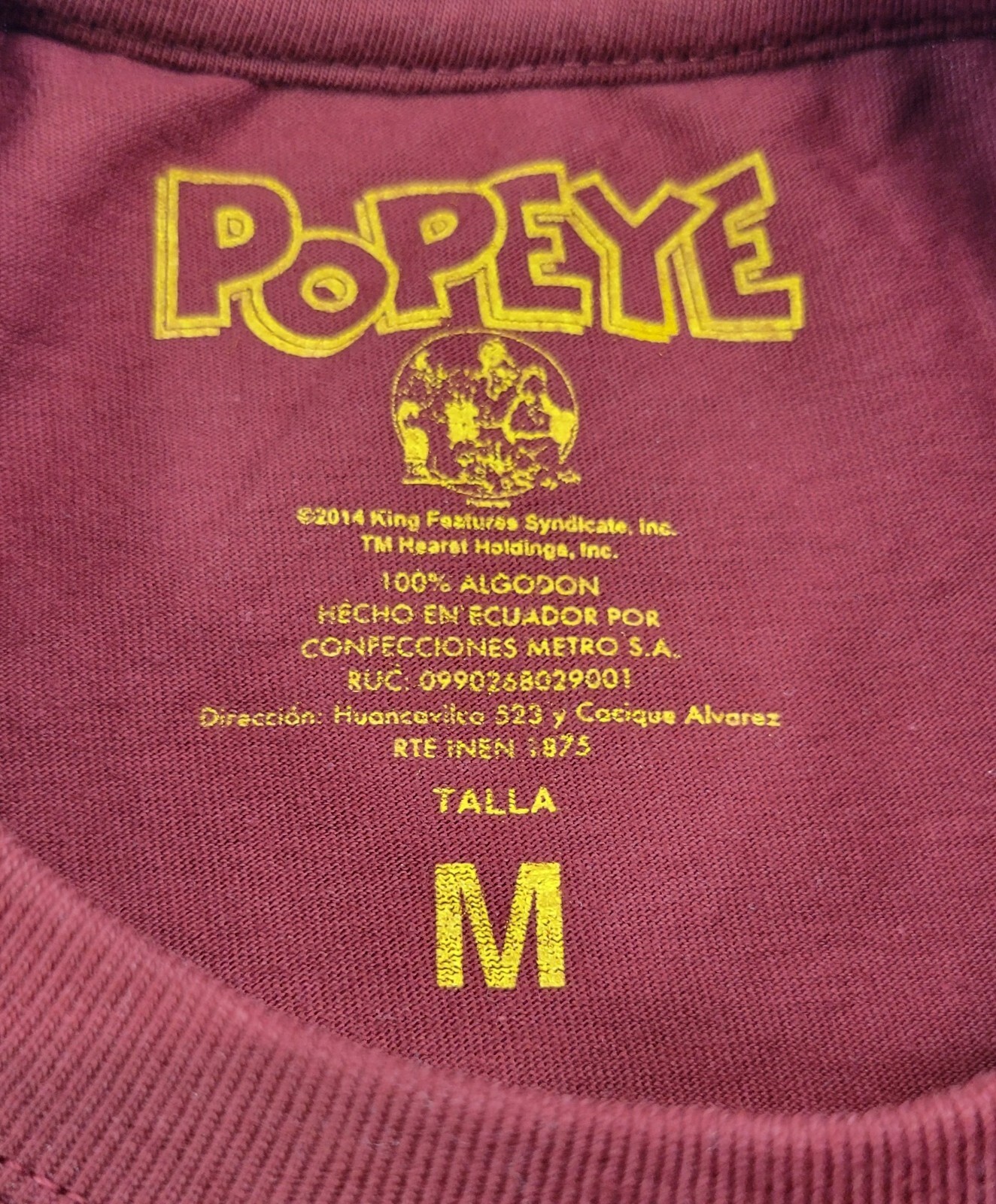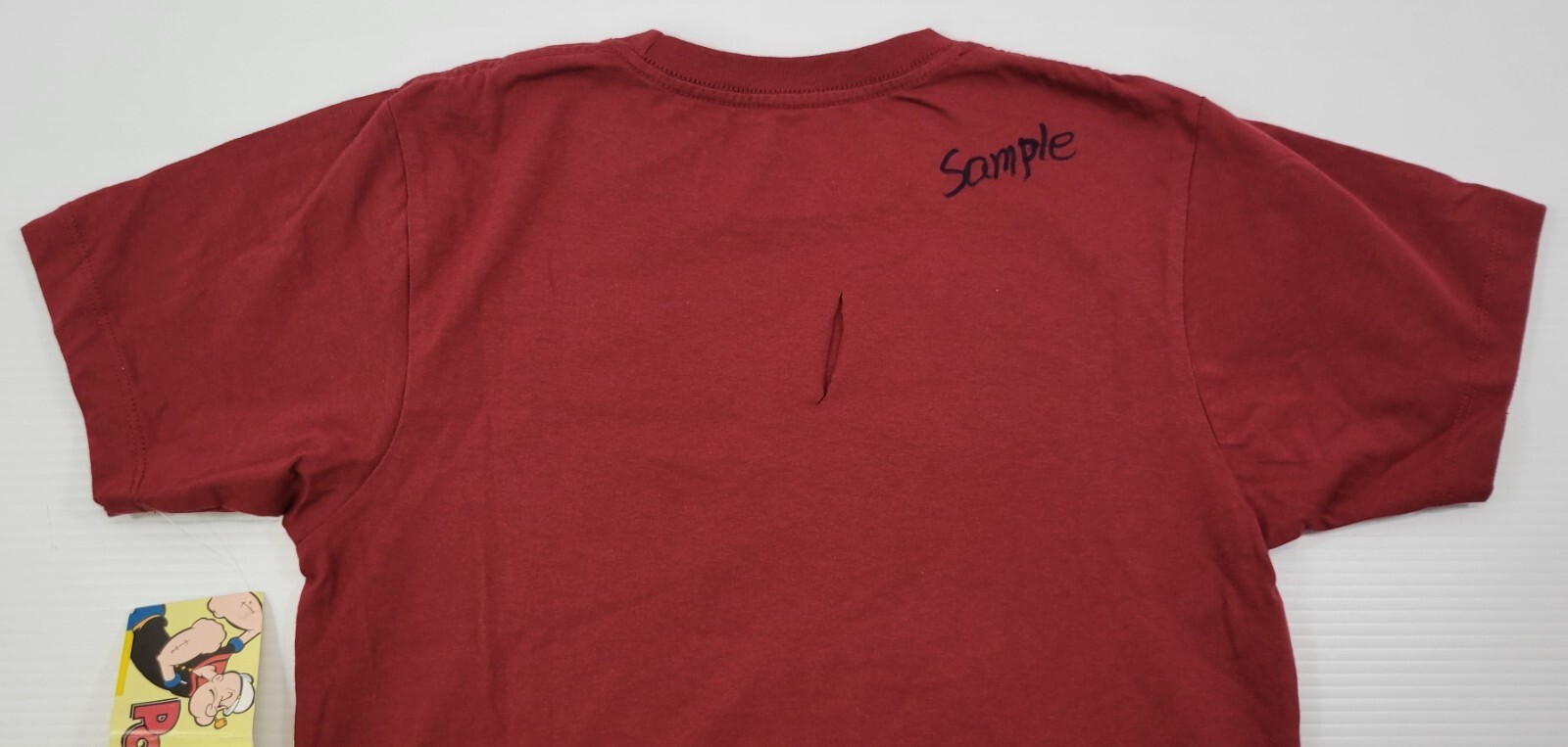 Shirt is a purposely DAMAGED salesman sample. Shirt fabric was purposely slit on backside and marked "sample" with permanent marker. It has never actually been worn, but used as a salesman sample for King Features Syndicate possibly for South American markets.