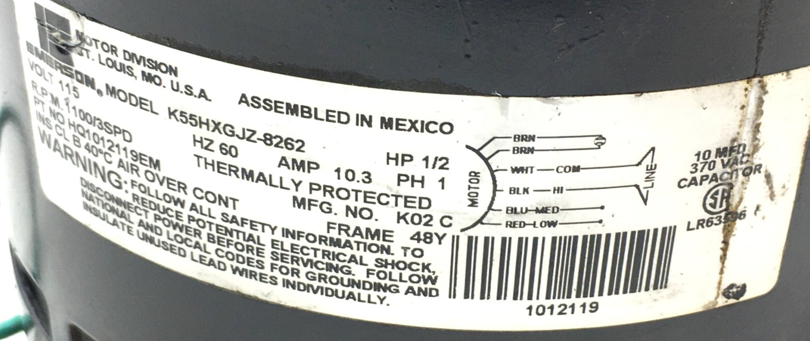 This is EMERSON K55HXGJZ-8262 Blower Motor HQ1012119EM 1/2HP 115V 1100RPM 3SPD used part.