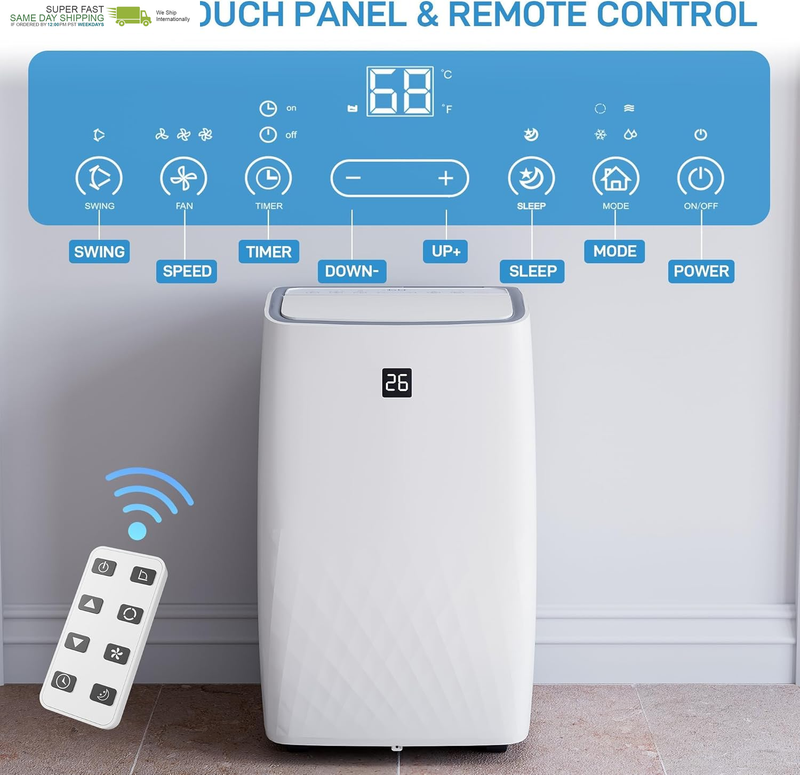?Front LED Digital Display Remote Control? Our portable air conditioners is equipped with an easy-to-read LED display that lets you know the operating status of the machine, and you can control the machine with the remote control in your hand to adjust temperature without getting up from bed/sofa