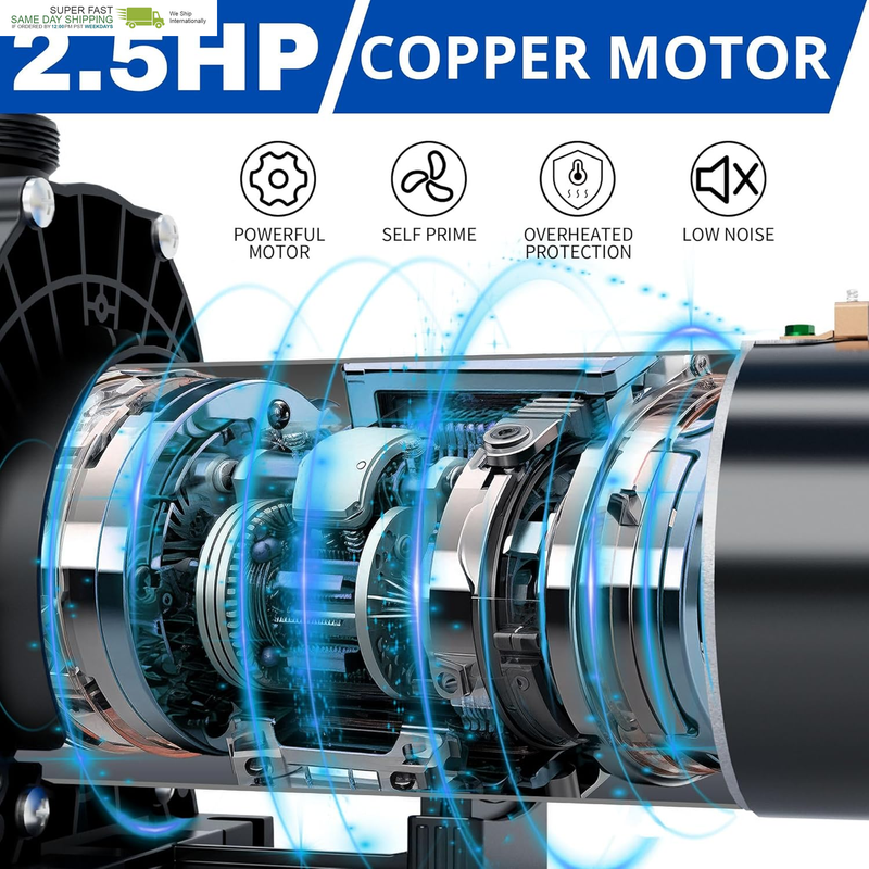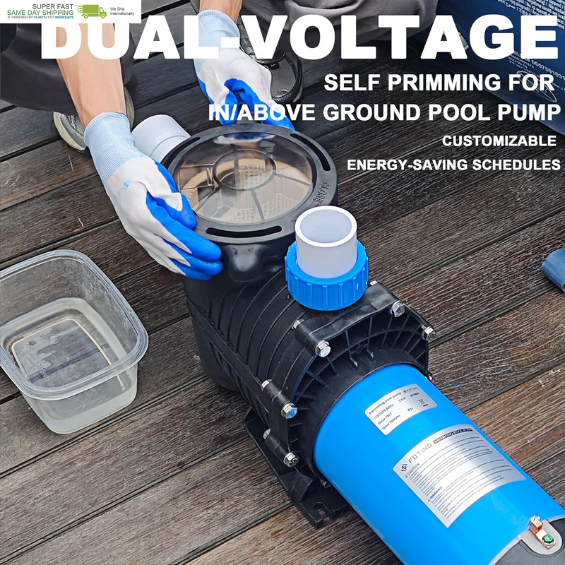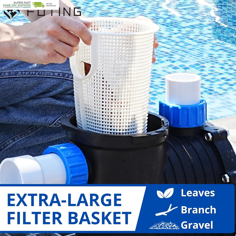 ?2.5HP Motor 7000GPH?Equipped with a robust copper wire motor, FOTING 2.5HP in/above ground pool pump delivers exceptional efficiency and performance, making pool maintenance a breeze. With a flow rate of up to 7000GPH and a Max.head lift of 79FT, it's perfectly suited for a variety of common swimming pools. The self primming capability can quickly start and maintain a strong flow of water.