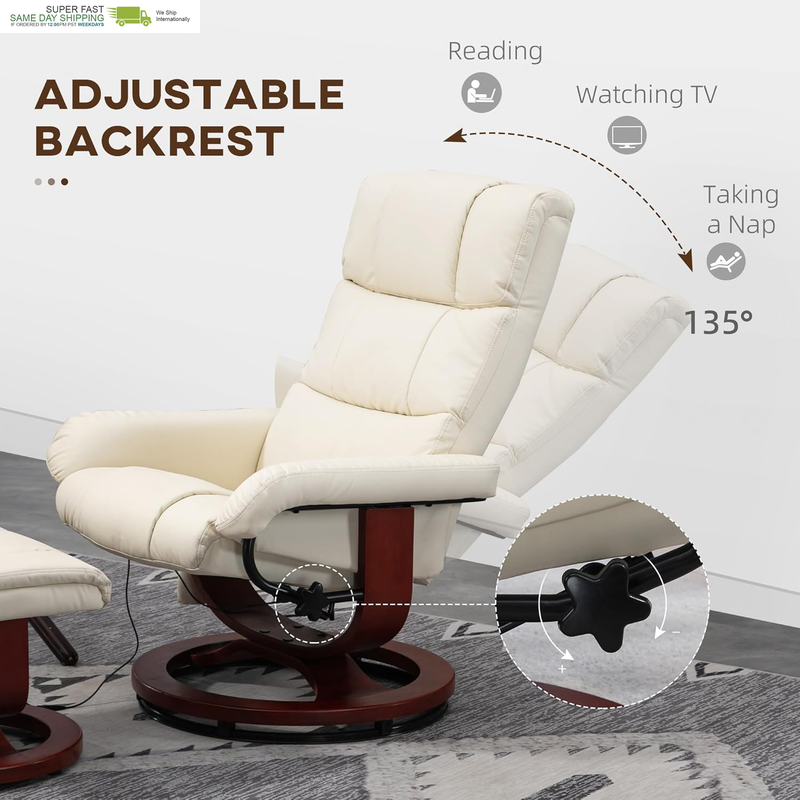 Freely reclines 110 to 135 with micro-lock knobs on the side of seat 10-point vibration massage in the back, lumbar, seat cushion, and footstool Two intensity levels and five modes for various types of massages Swivel base with thick padding and an ottoman so you can put your feet up Remote control included with a handy side pocket for storage PU leather is luxurious and requires minimal maintenance Eucalyptus wood base and steel frame for good bearing capacity Assembly required