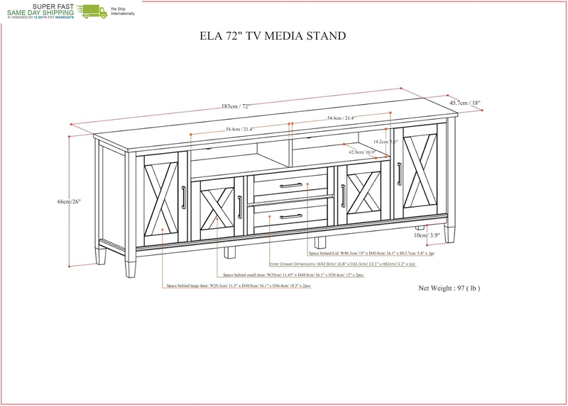 Now that 80 inch flat screen TVs are more affordable, you need to have one. To enjoy it fully, you will also need the perfect TV Stand to position your TV just right. Look no further. The Ela 72 inch TV Media Stand is perfectly sized for TVs up to 80 inches. It has plenty of storage space for all your media and gaming devices. It has a large centrally located open area with two drawers as well as two enclosed spaces. The two large side storage cabinets open to one adjustable shelf each. The unit features cord management cut-outs for easy installation of TV and media components.